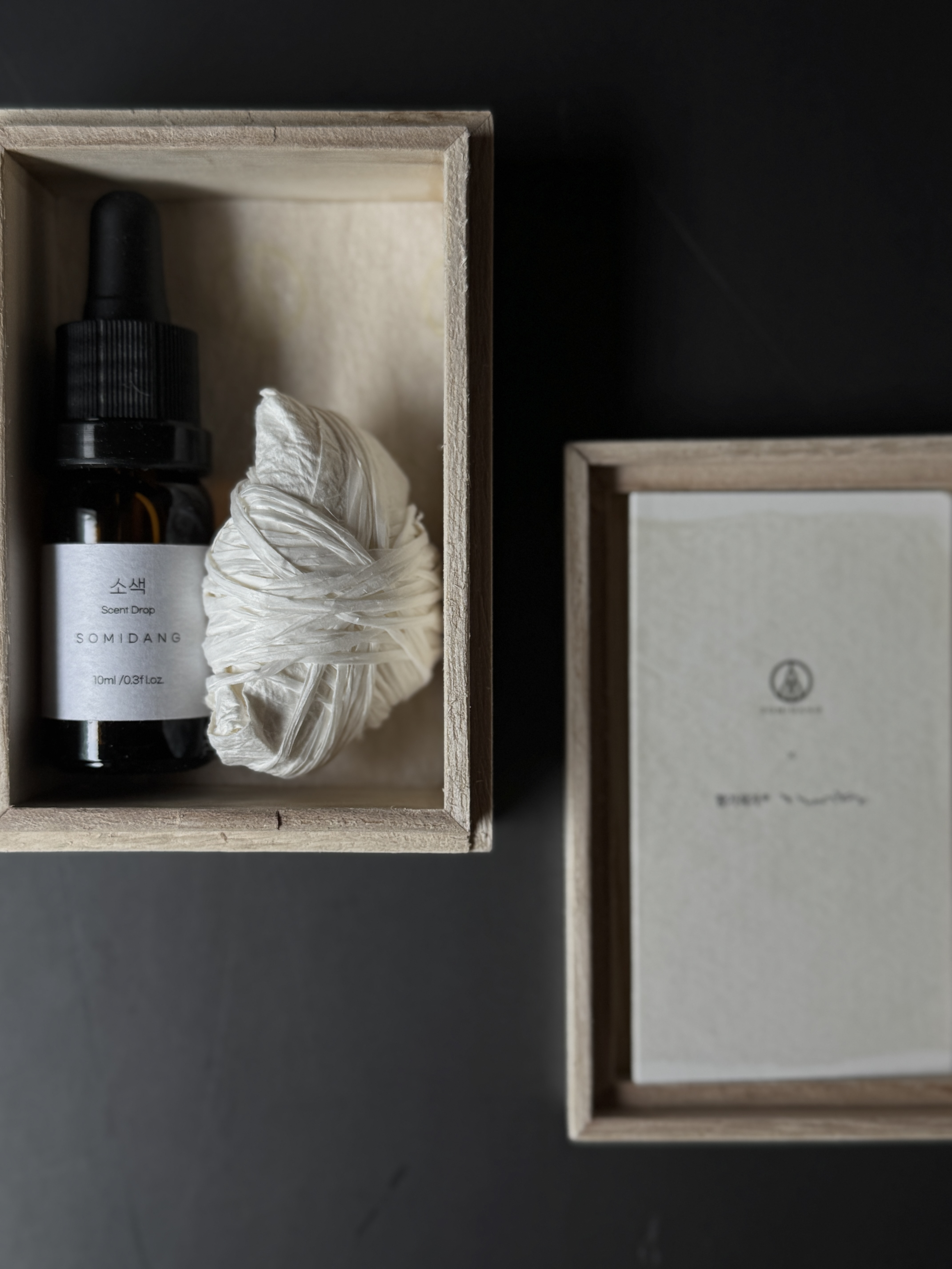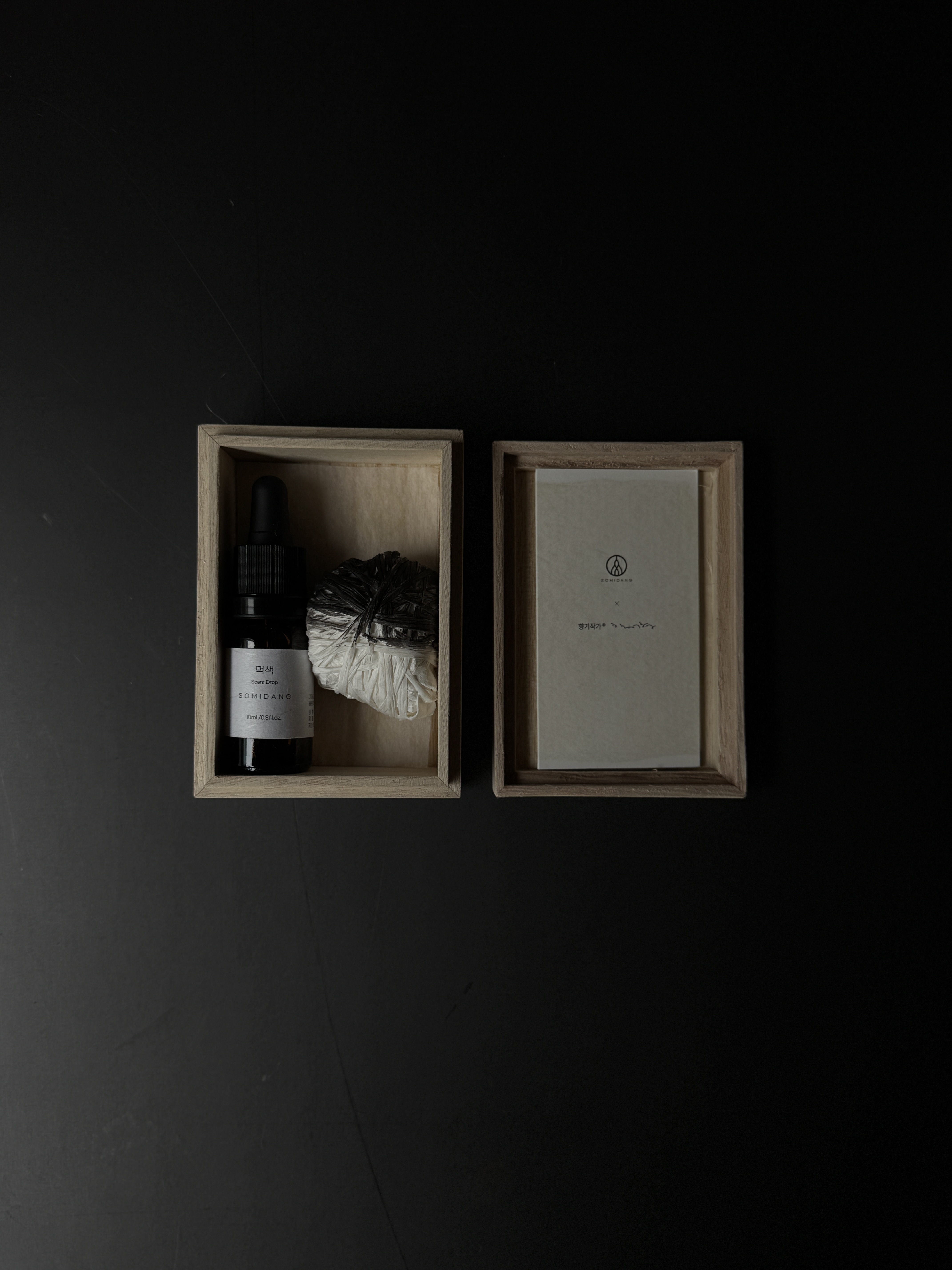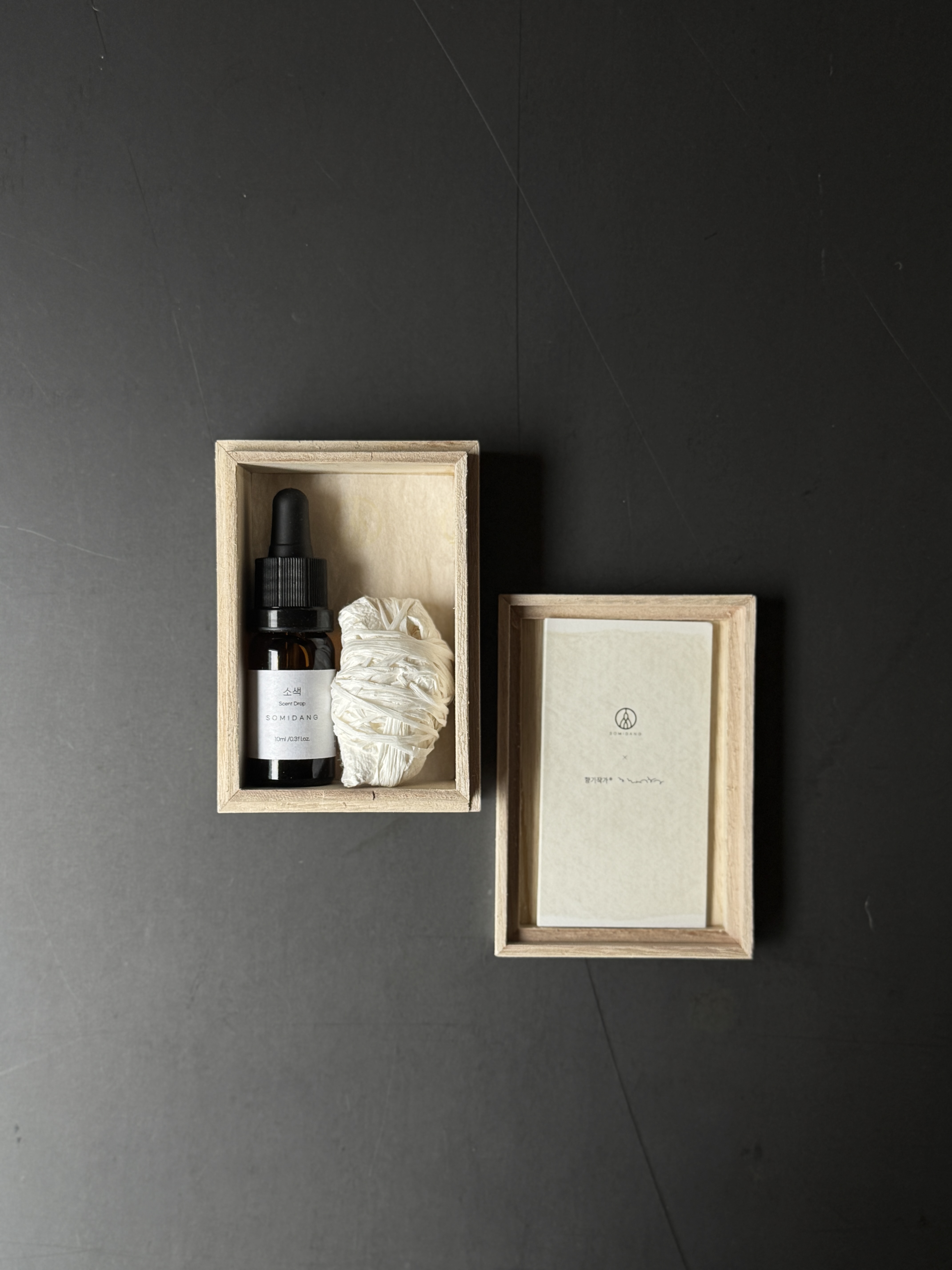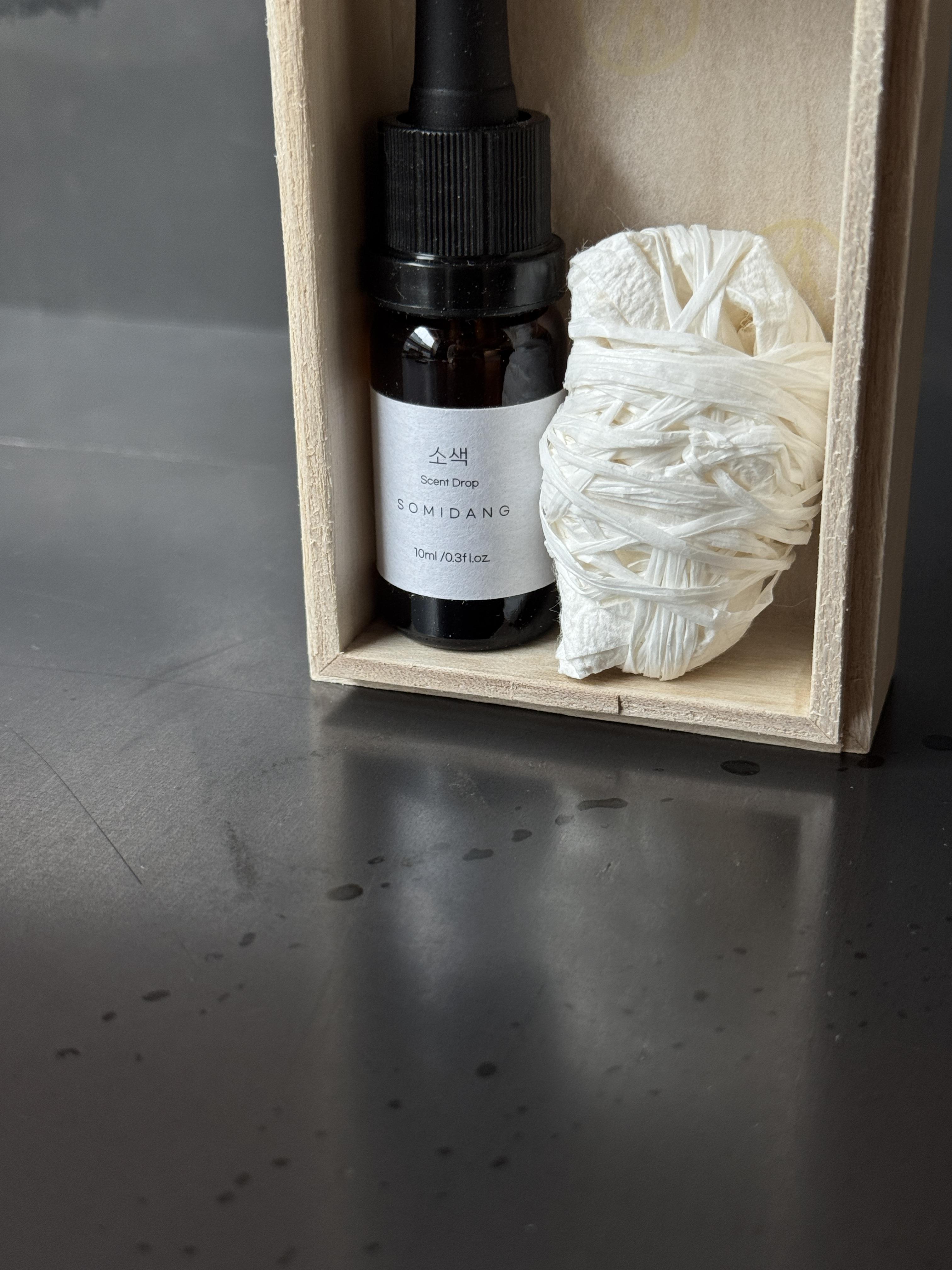 함을 열어 원하시는 발향 정도에 맞춰 센트 오일을 한지볼 위에 떨어뜨려 줍니다.