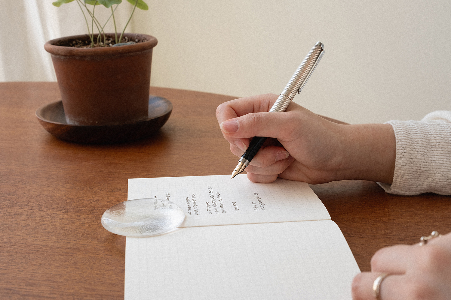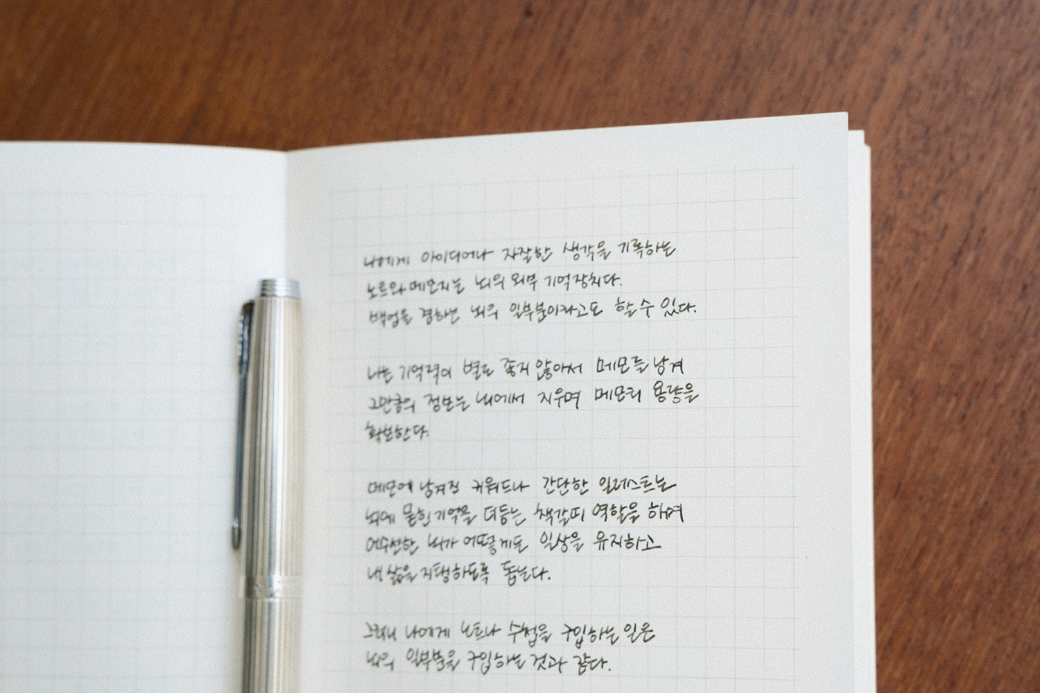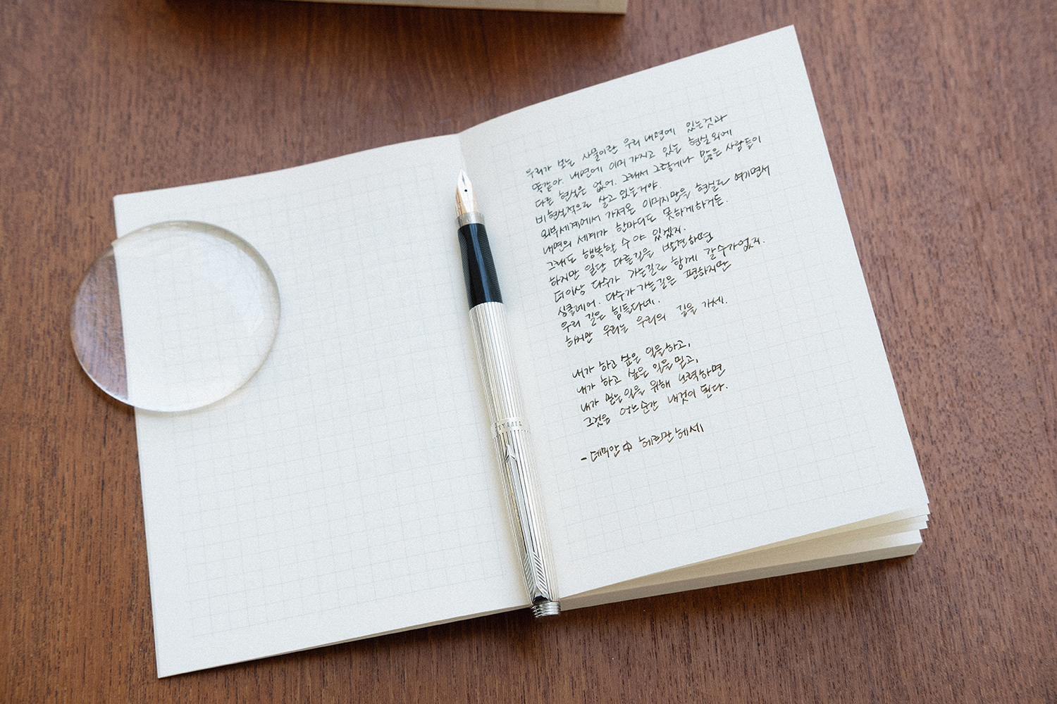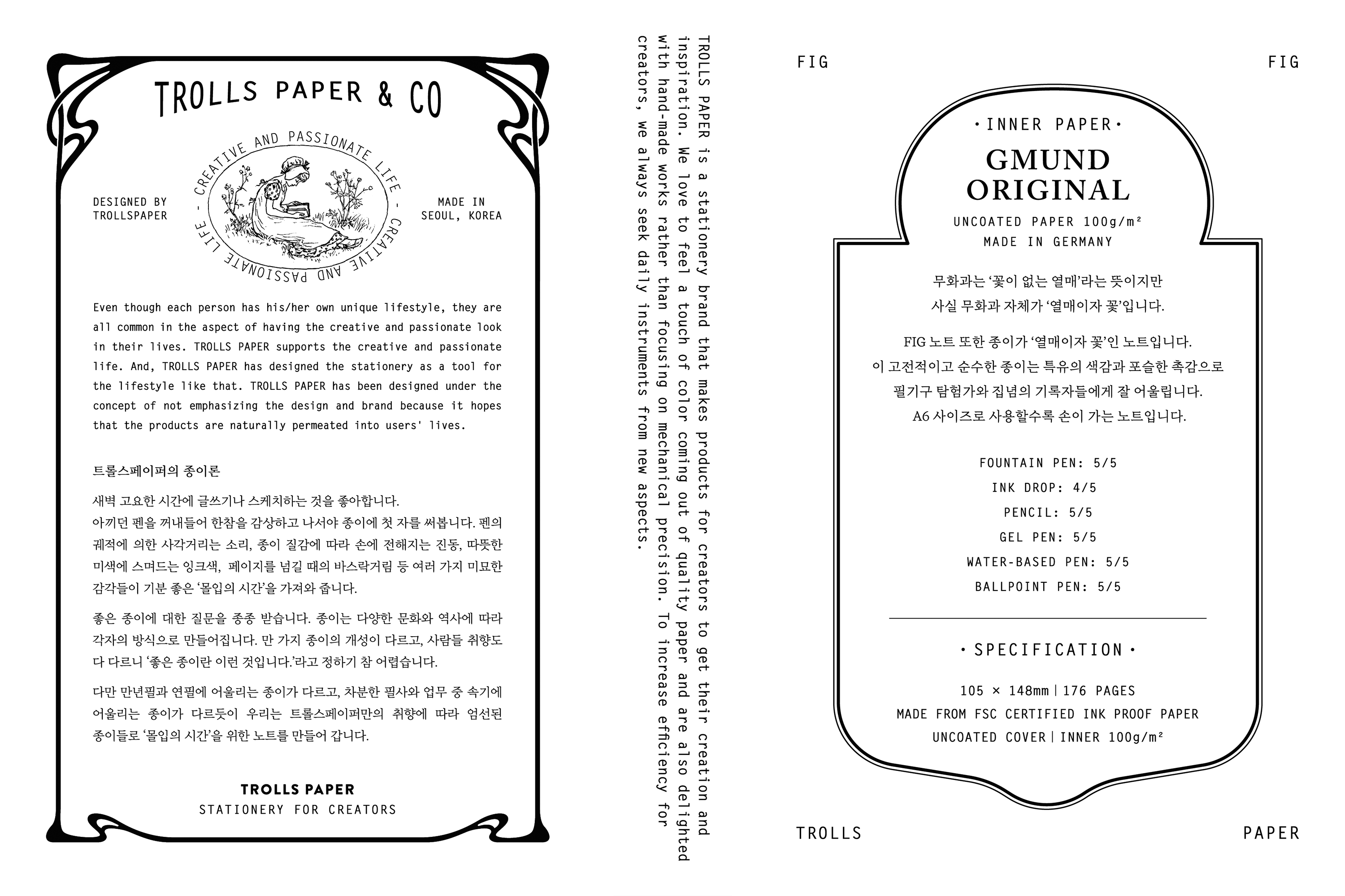내지는 공들여 연구한 종이인 오리지널 그문드 100g의 종이를 사용했습니다. 만년필 상성이 좋은 종이이며 세필과 태필 표현이 선명하고 잉크 발색이 좋은 종이 입니다. 현대적인 필기구 부터 만년필까지 다양한 매력의 필기구 사용이 가능합니다.