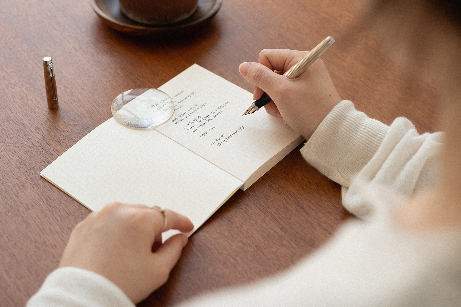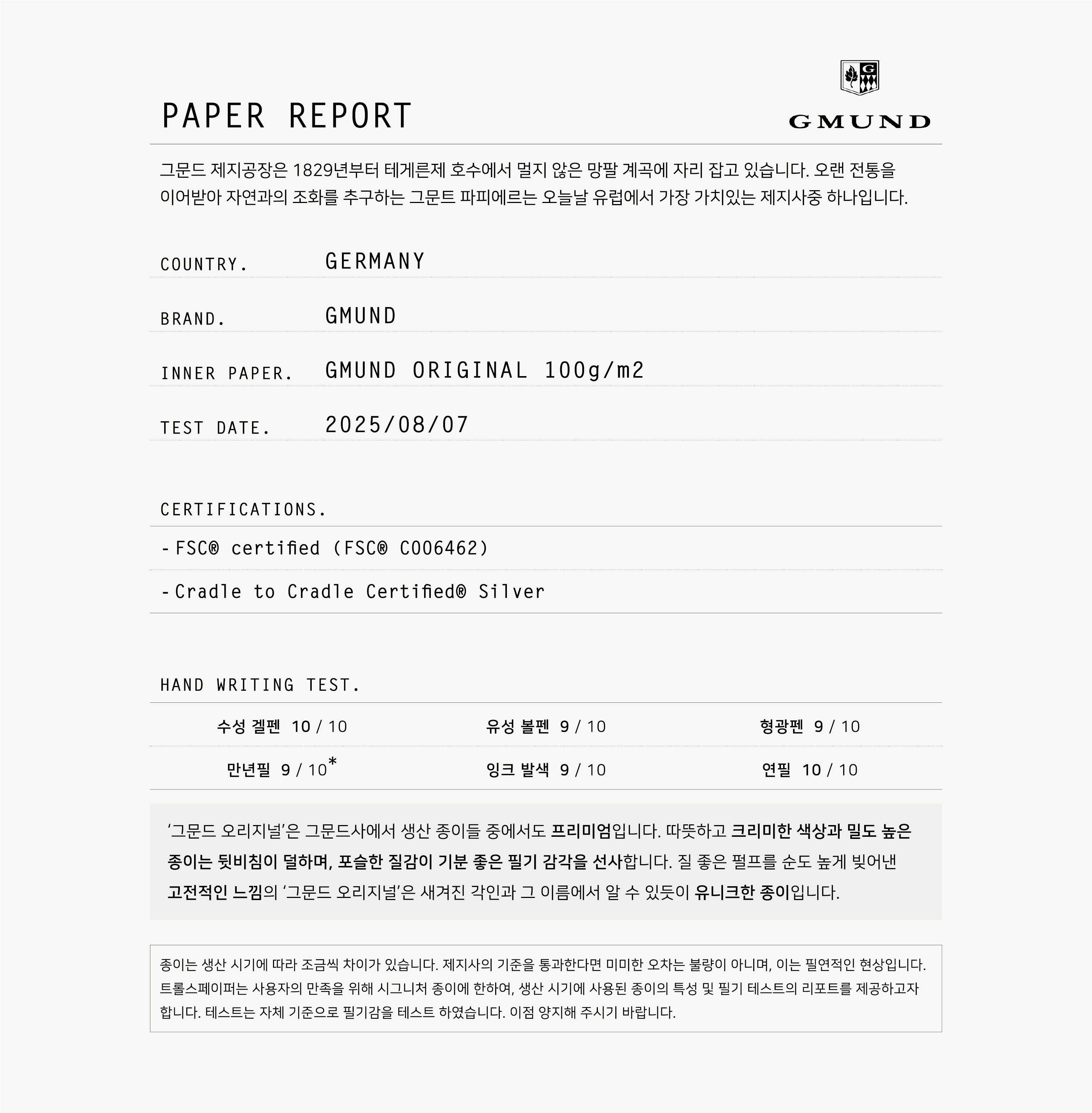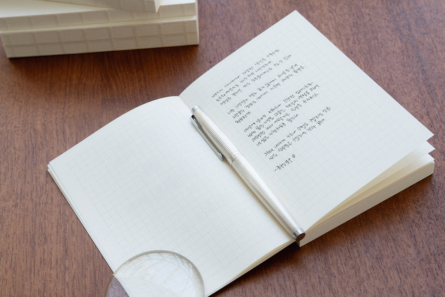 피그노트는 실 제본으로 180도로 평평하게 펼쳐져 편안한 기록이 가능합니다. 내지는 공들여 연구한 종이인 오리지널 그문드 100g의 종이를 사용했습니다. 만년필 상성이 좋은 종이이며 세필과 태필 표현이 선명하고 잉크 발색이 좋은 종이 입니다. 현대적인 필기구 부터 만년필까지 다양한 매력의 필기구 사용이 가능합니다.