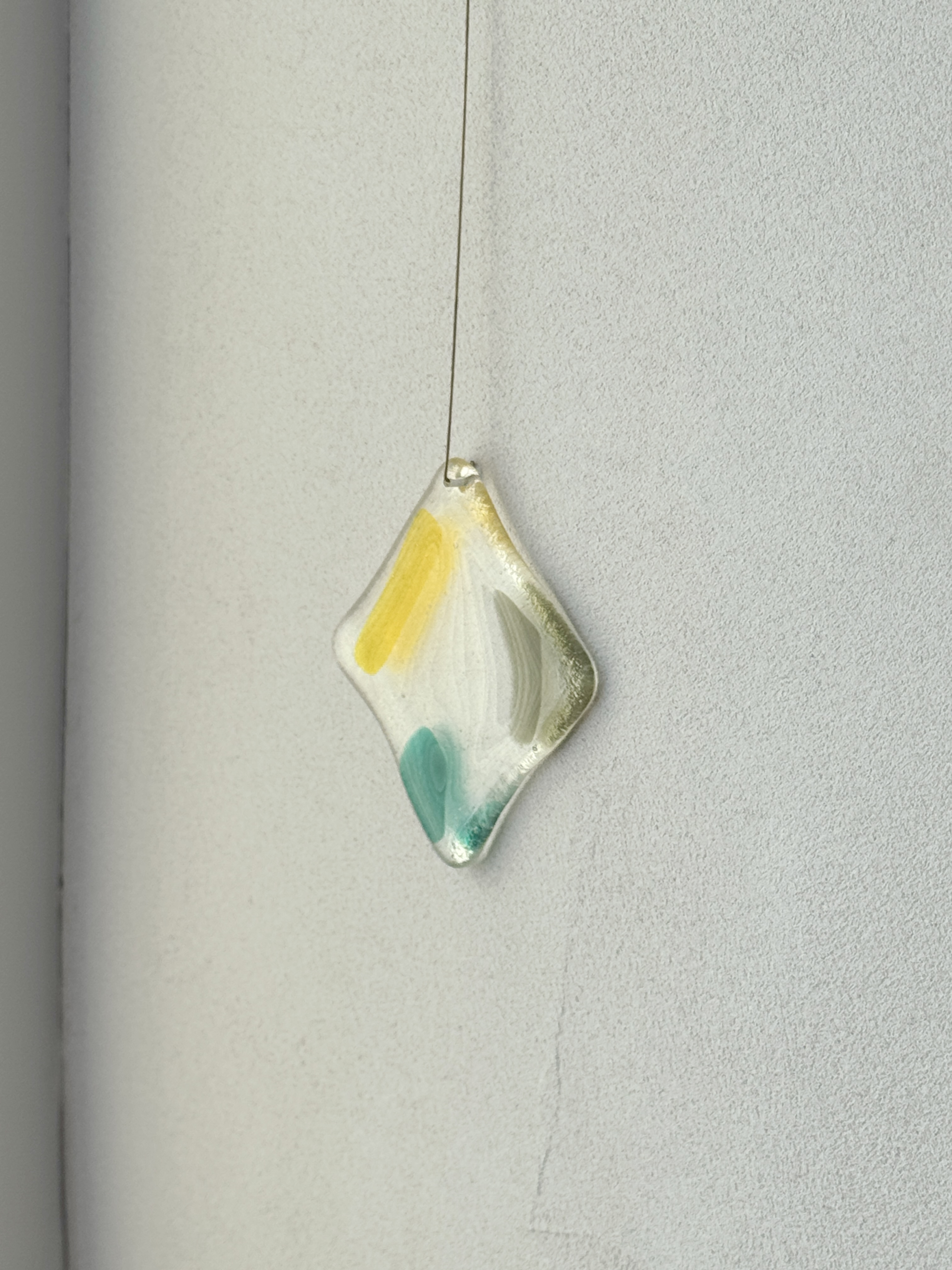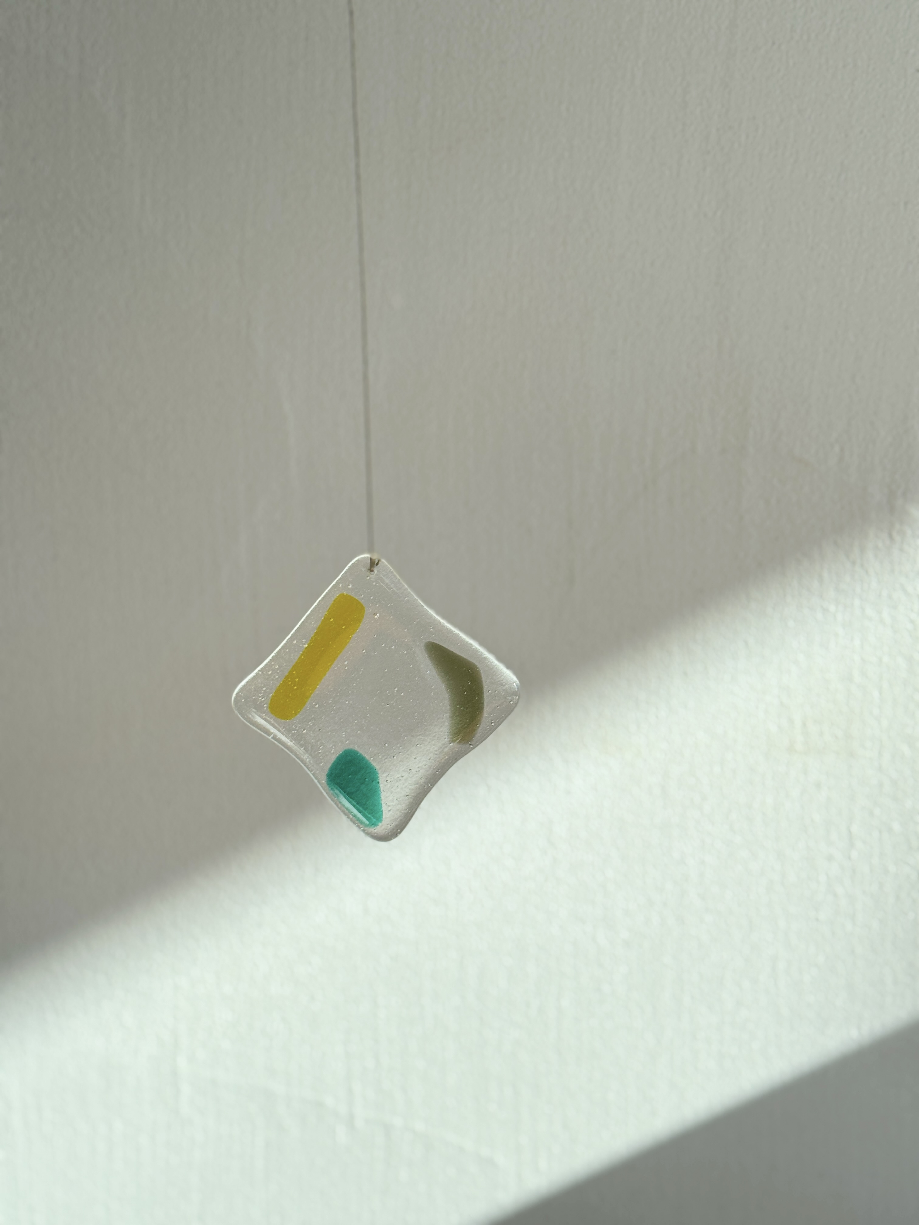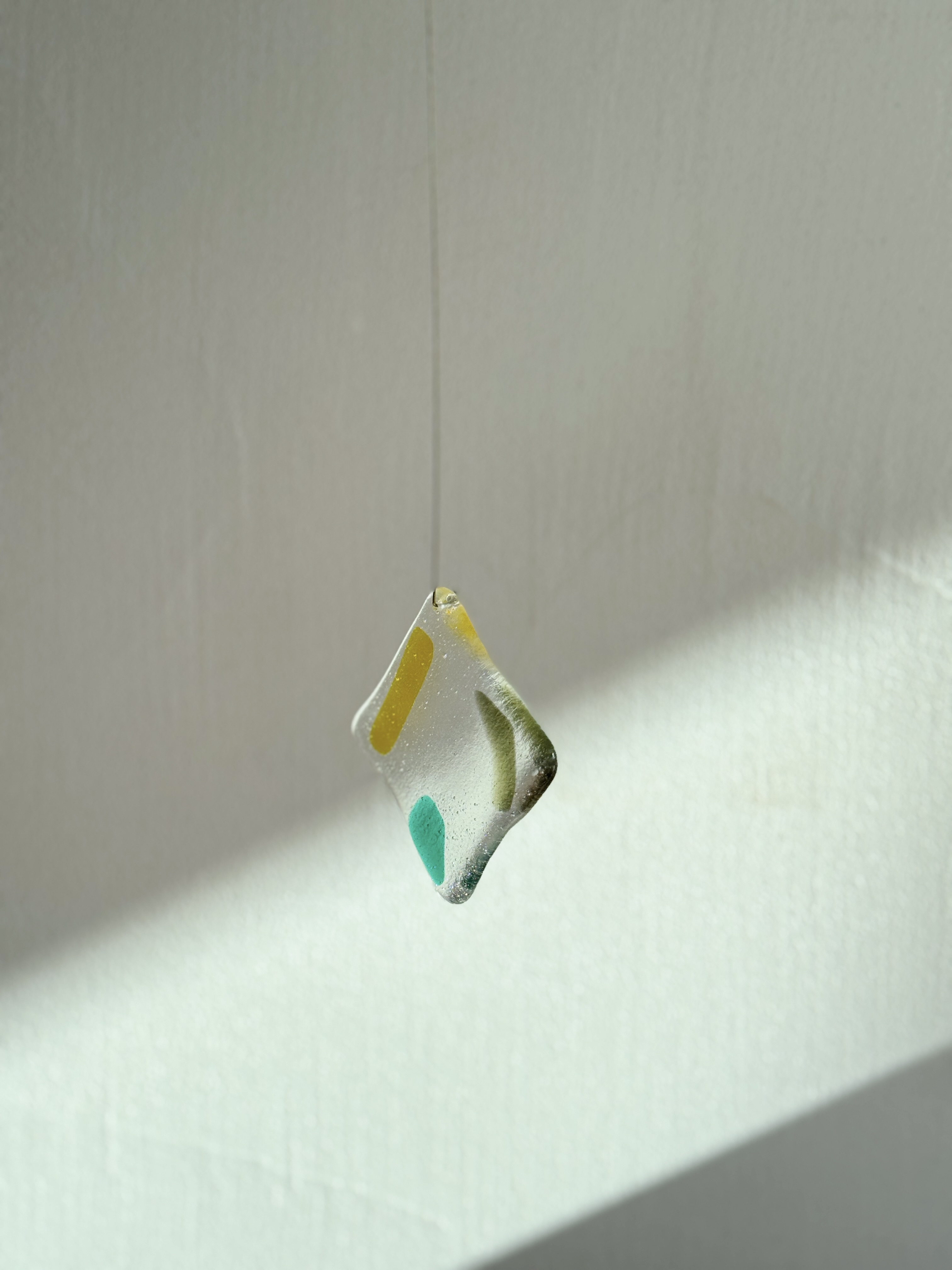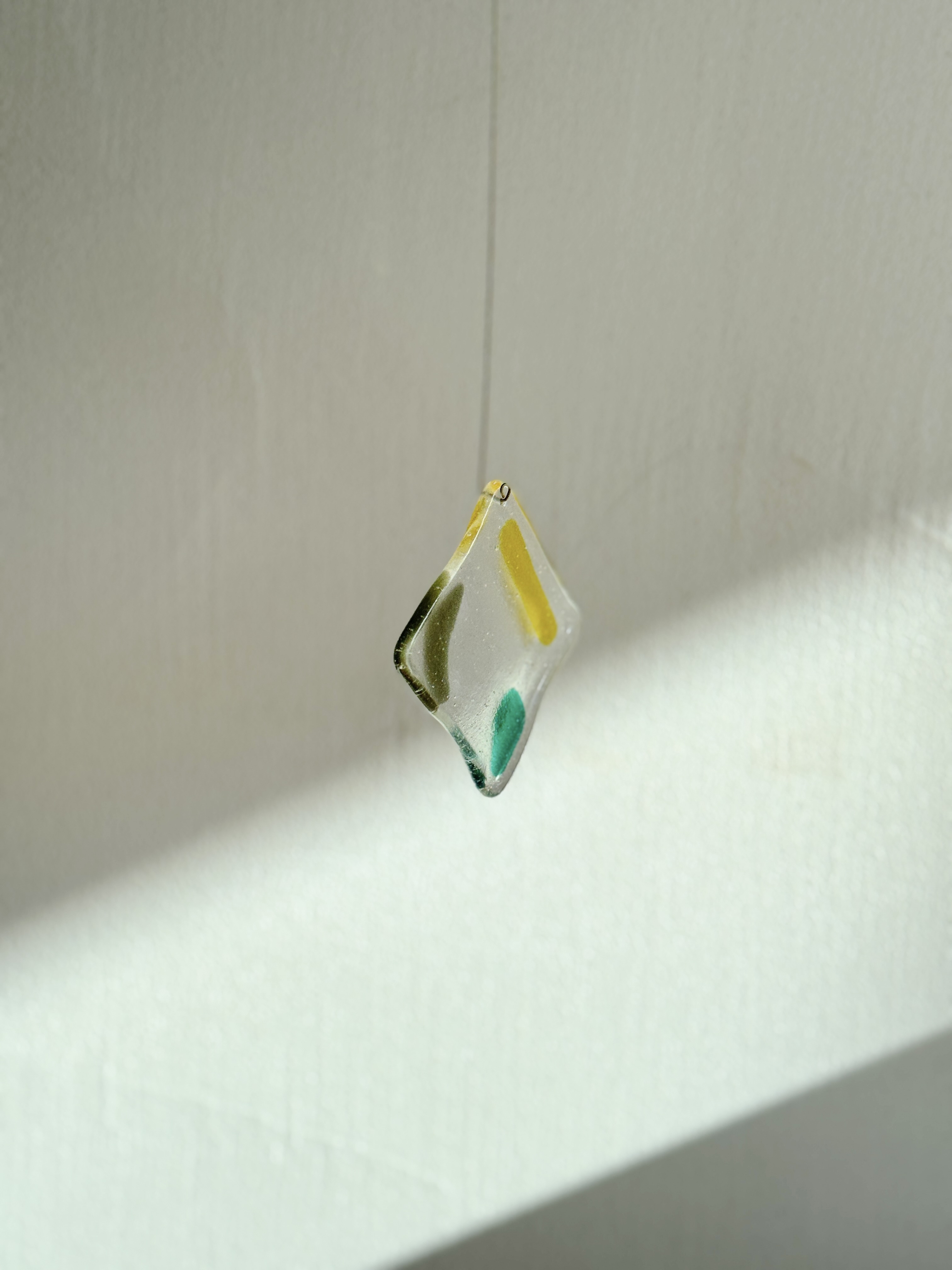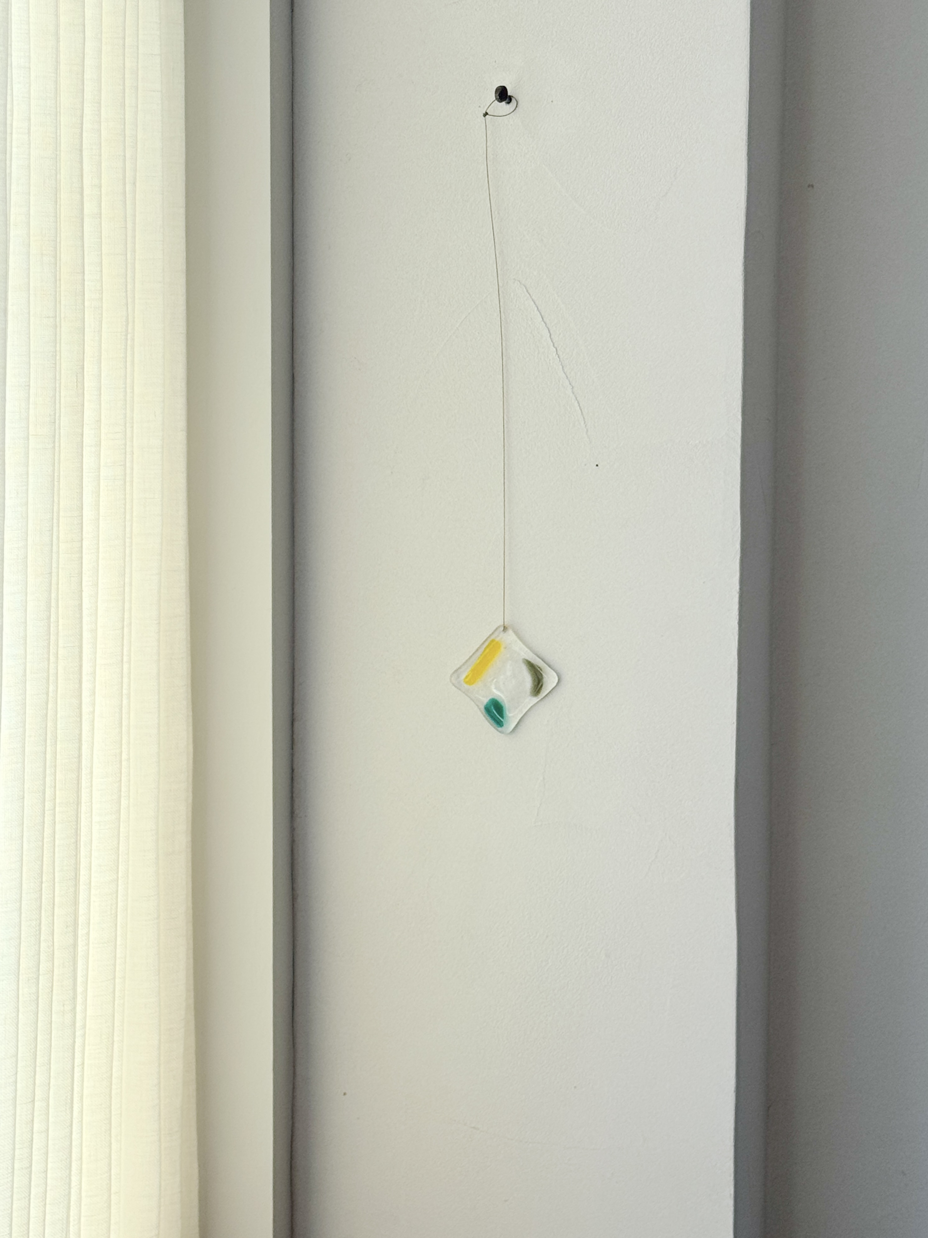 빛의 움직임이 아름다운 작품으로, 유리에 구멍을 뚫어 금속 선이 연결되어 벽에 걸어 놓을 수 있습니다. 빛이 들어오면 유리가 자연스럽게 색을 흘리고, 벽이나 창가 한 켠에 포인트로 두기 좋은 작품입니다.