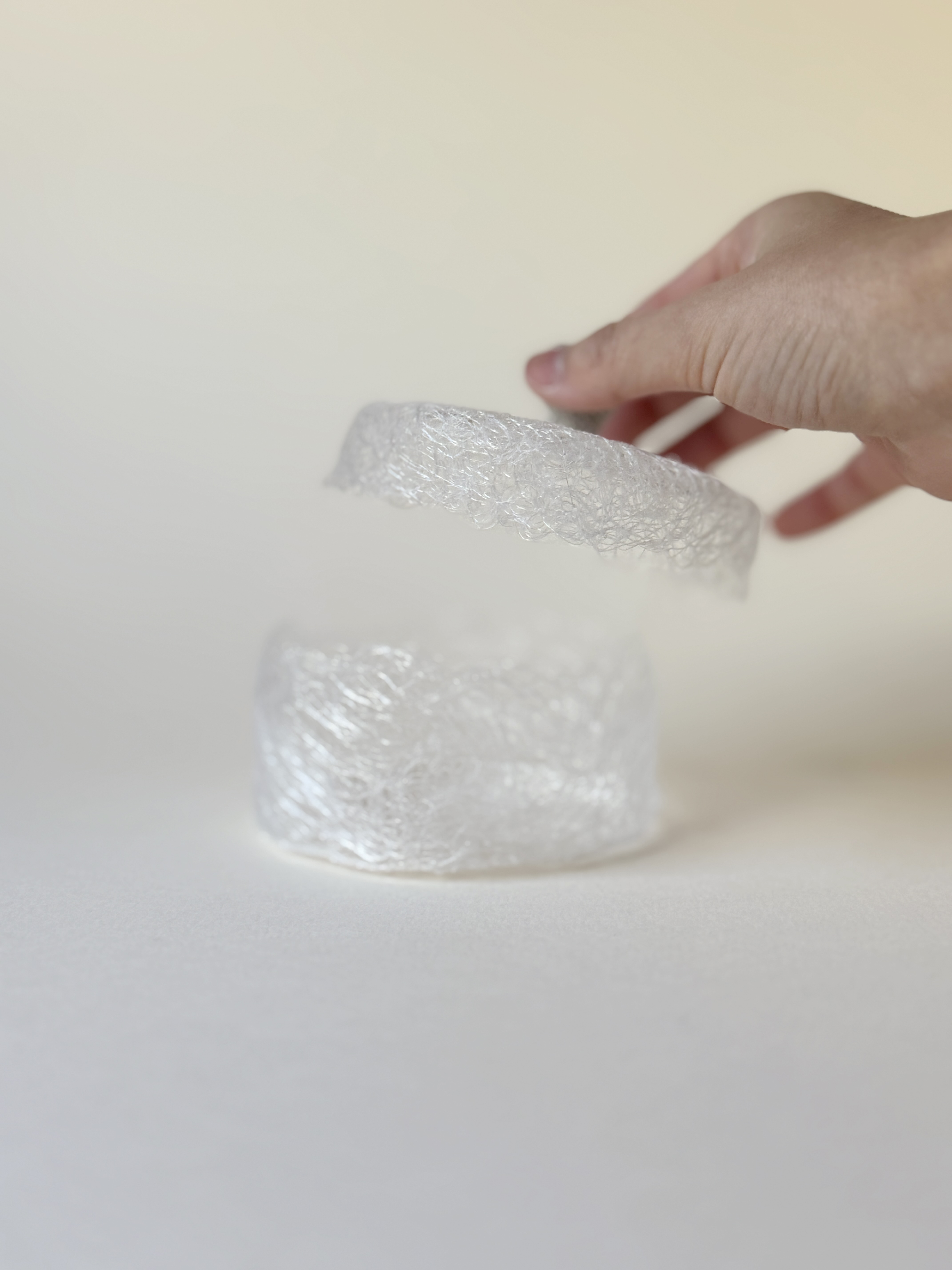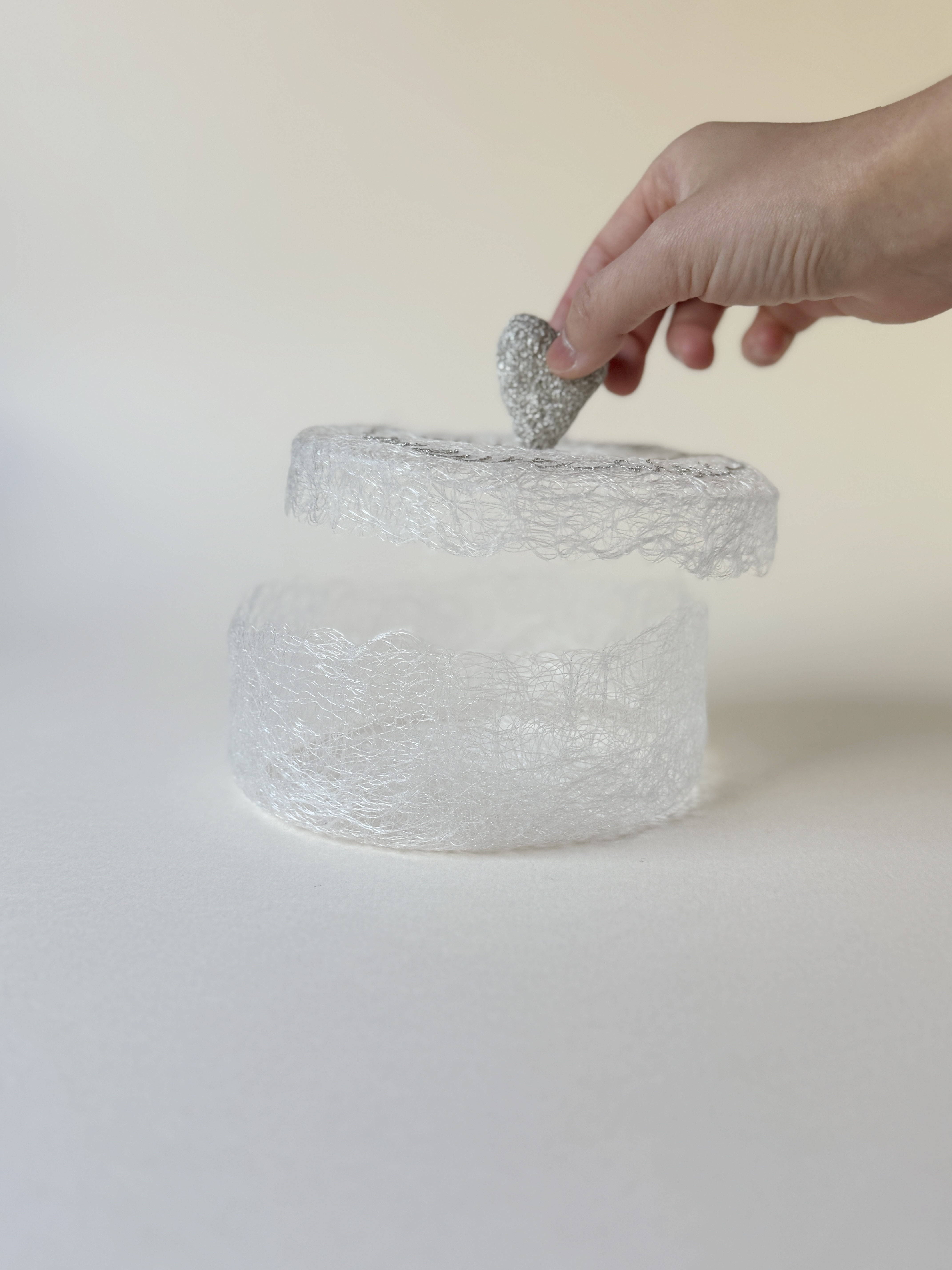 섬유 작업을 하며 평면 원단 위에 무언가를 새기는 방식에서 벗어나 공간을 만들어보고 싶다고 생각하게 되었어요. 얇은 실로 입체적인 형태를 구성하다 보니, 자연스럽게 빛을 만났을 때 섬세한 그림자가 드리워지더라고요.