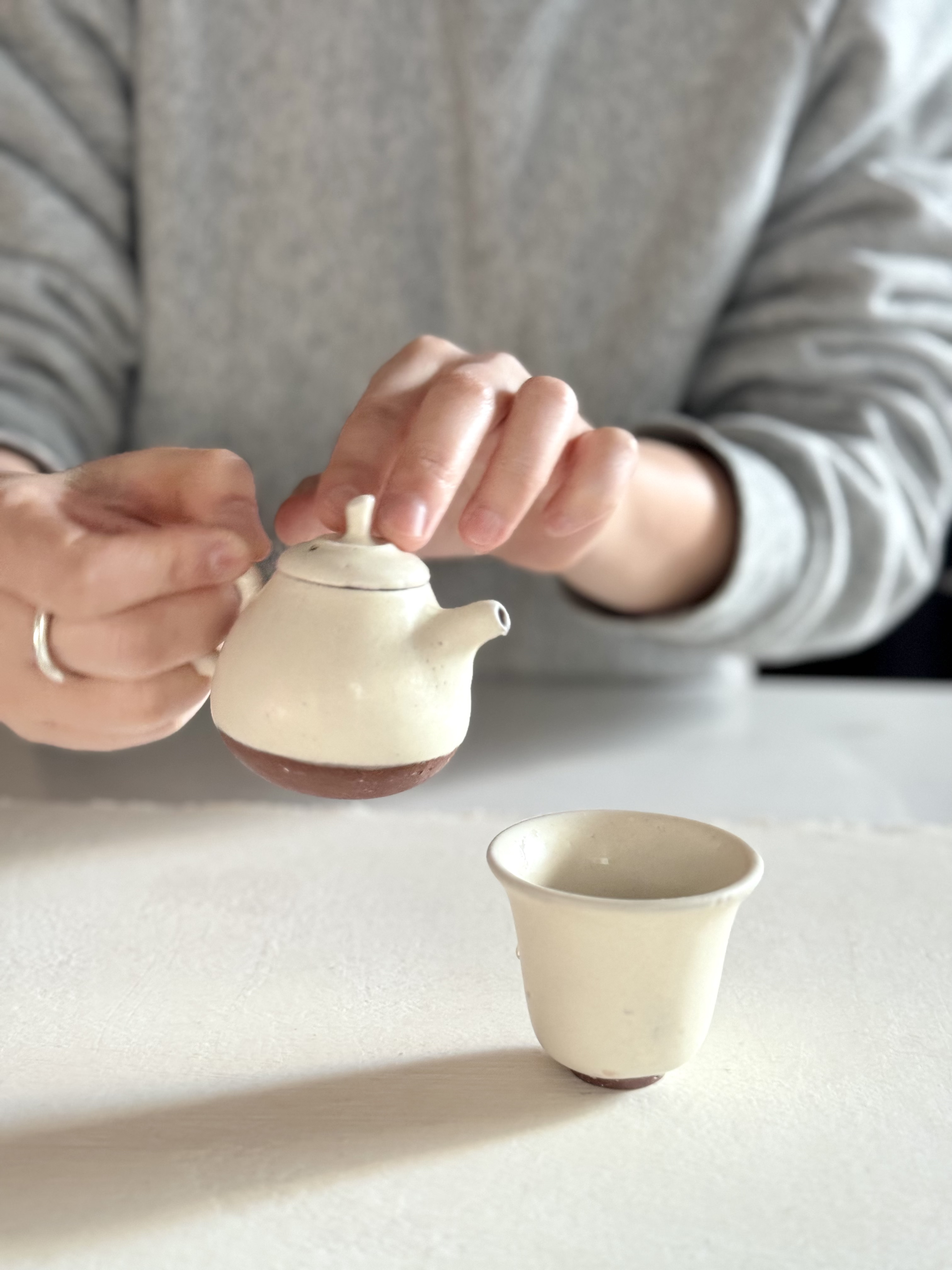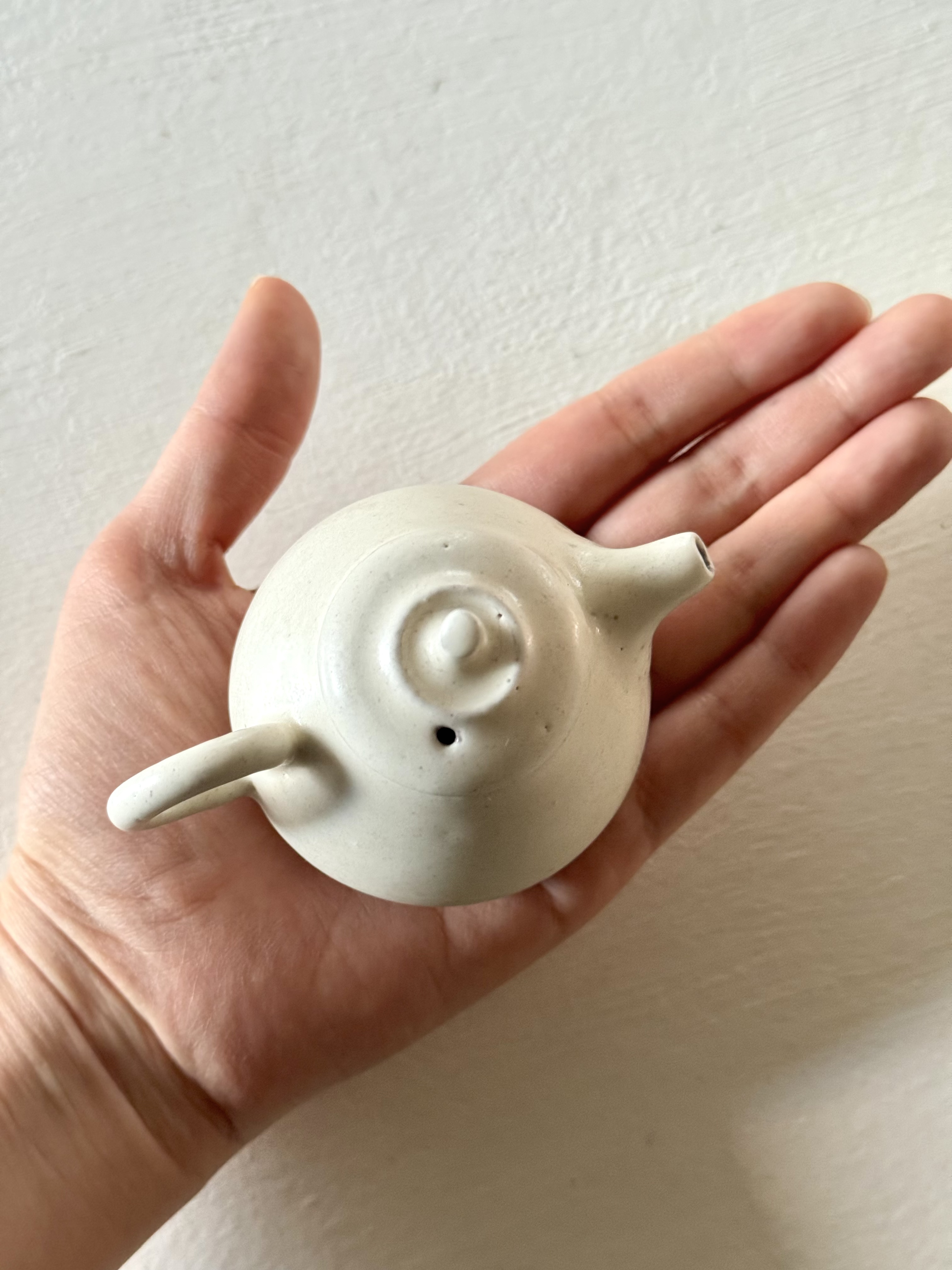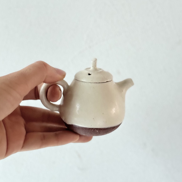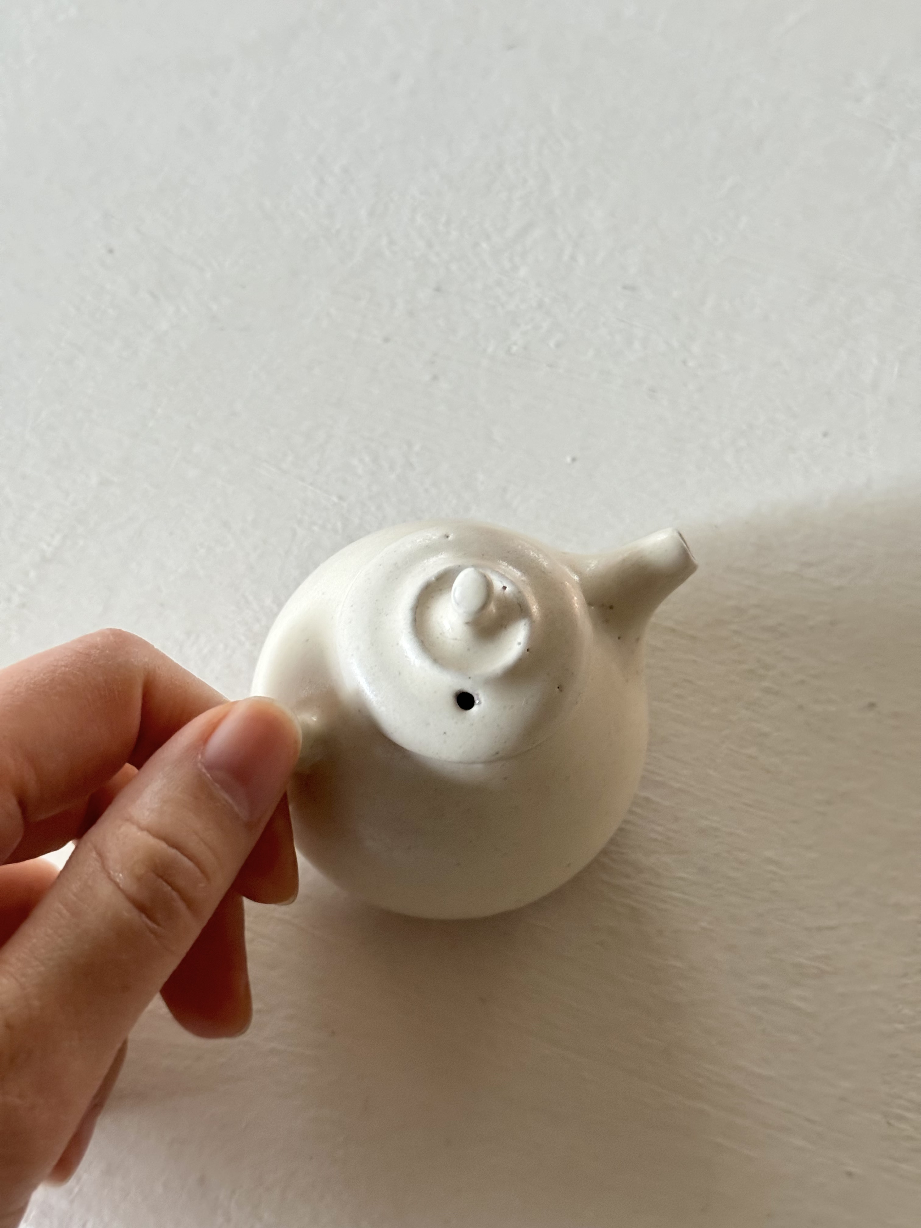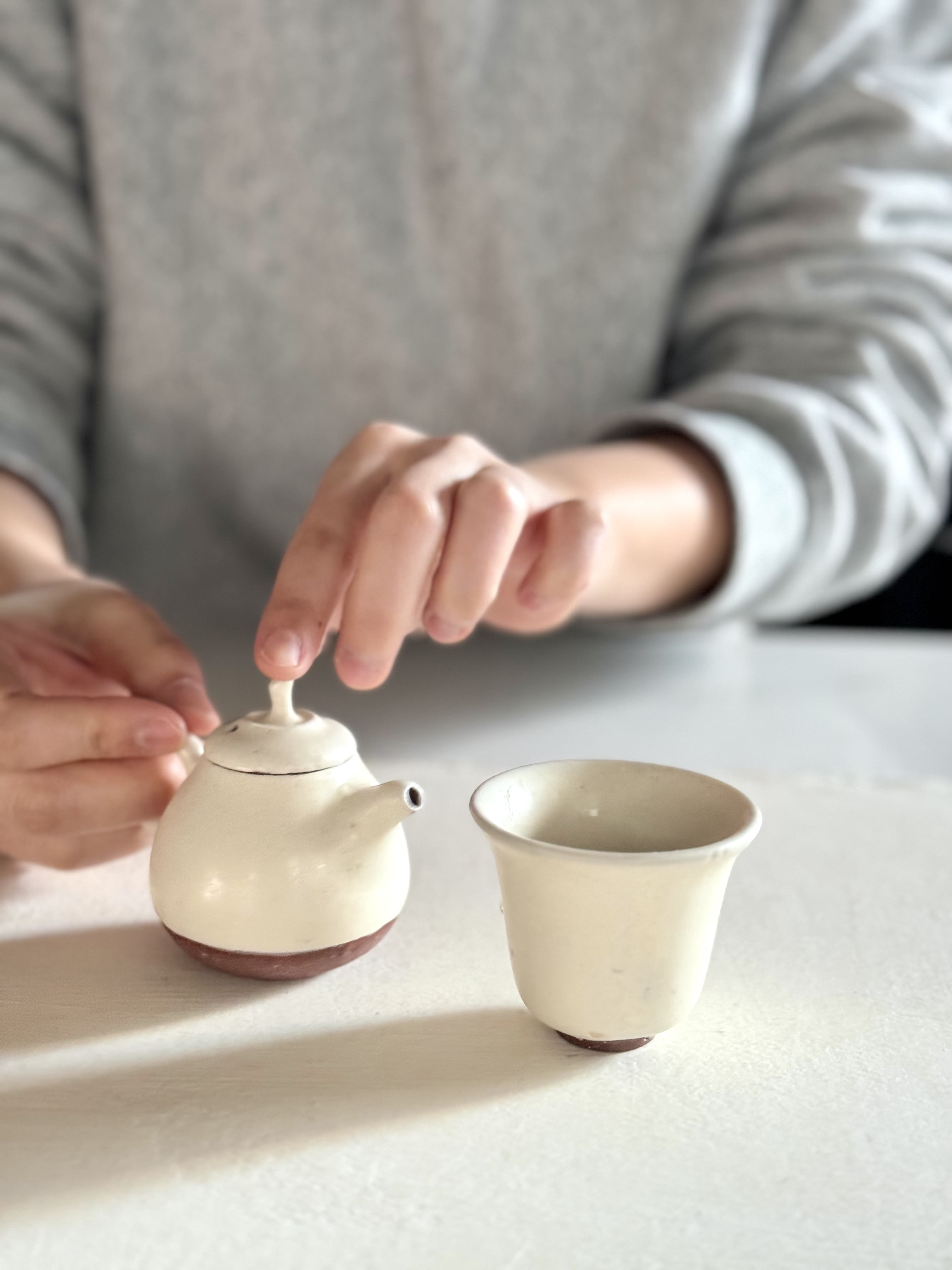 우윳빛색감의 차호는 1-2인 찻자리에서 사용하기 좋은 크기이며, 흘러내리는 유약과 표면의 질감이 매력적입니다.