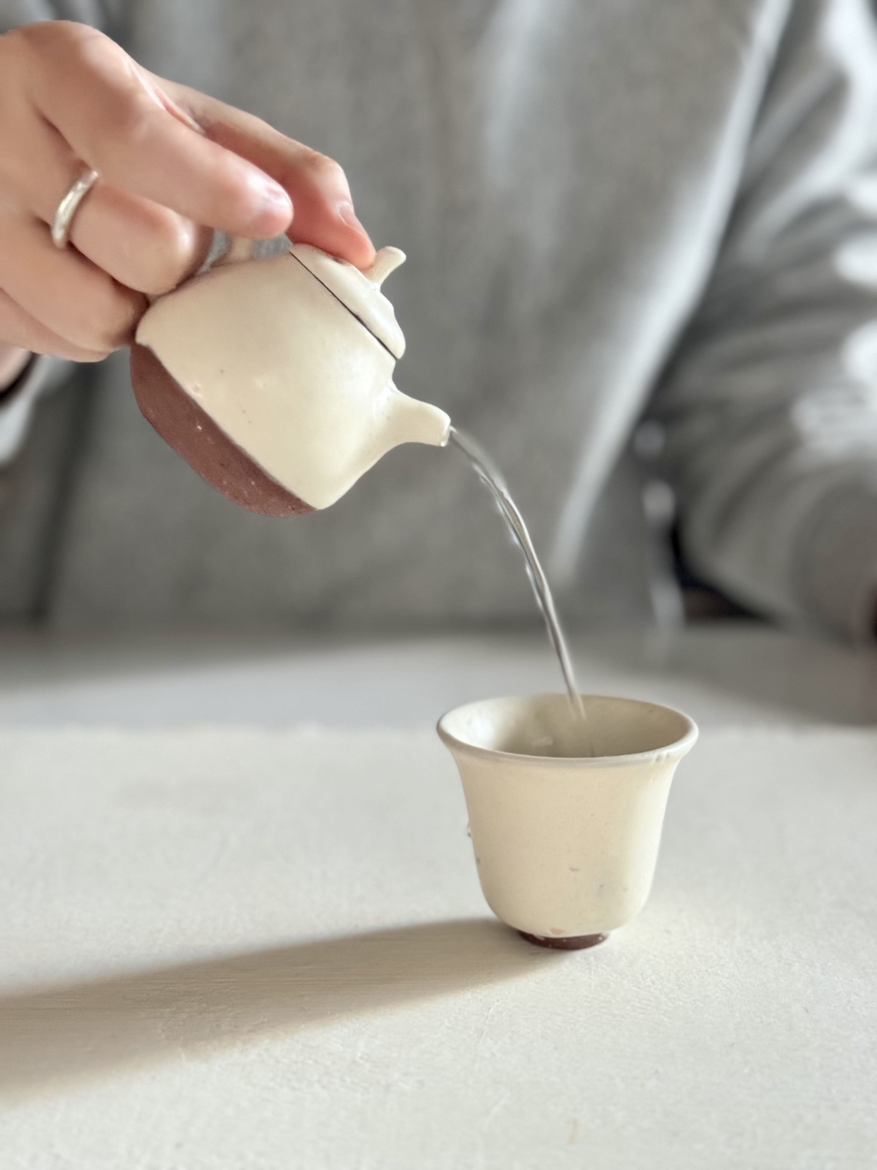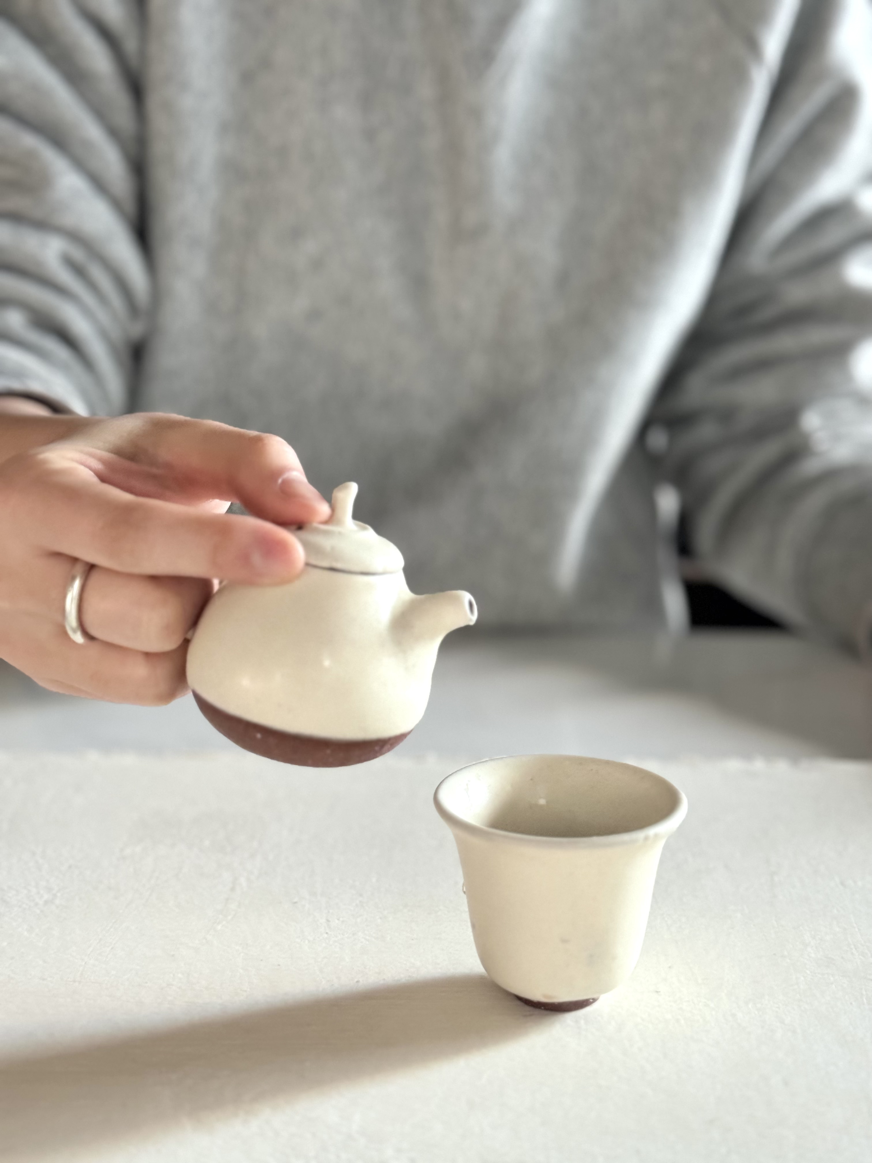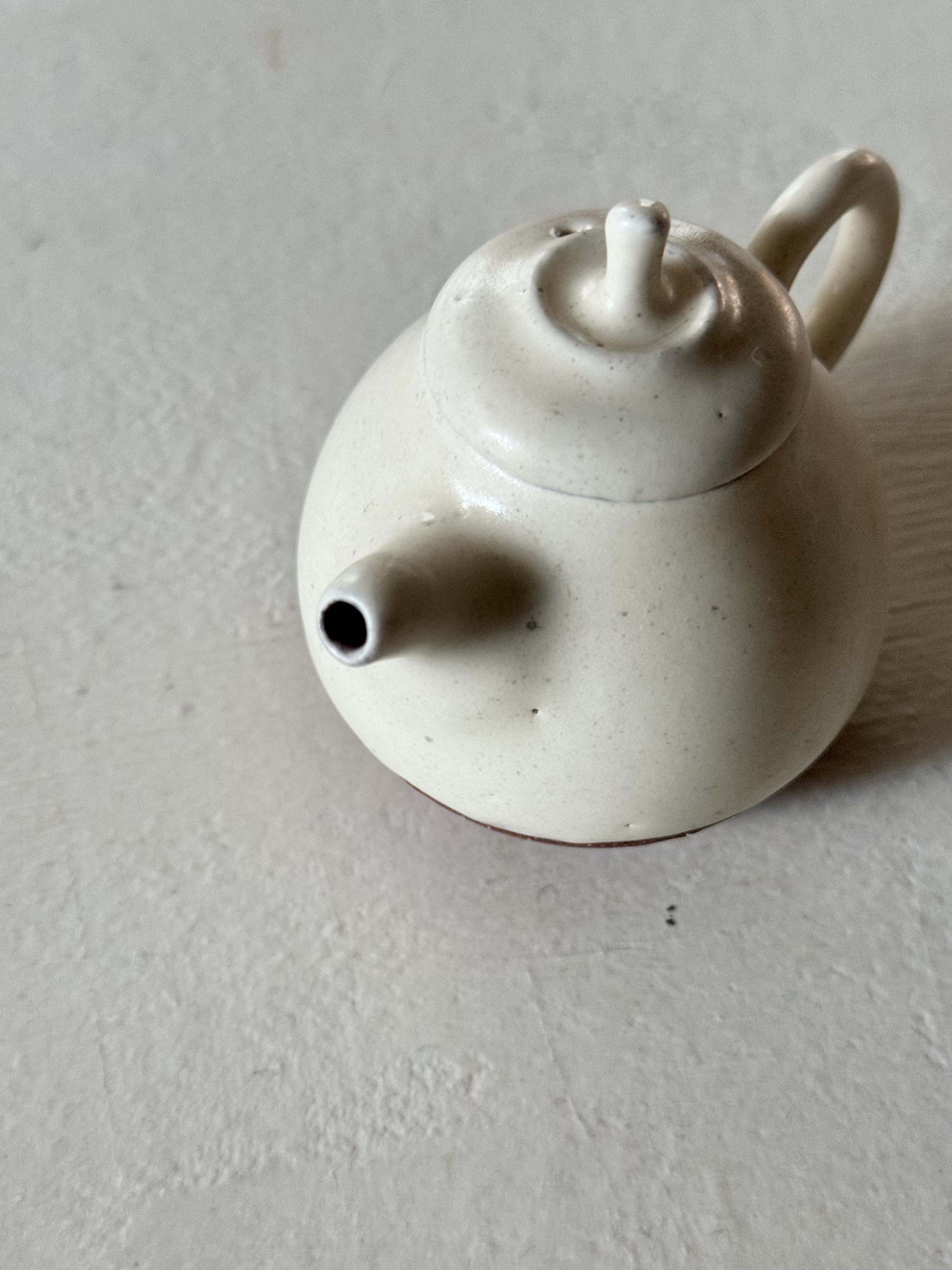 우윳빛색감의 차호는 1-2인 찻자리에서 사용하기 좋은 크기이며, 흘러내리는 유약과 표면의 질감이 매력적입니다.