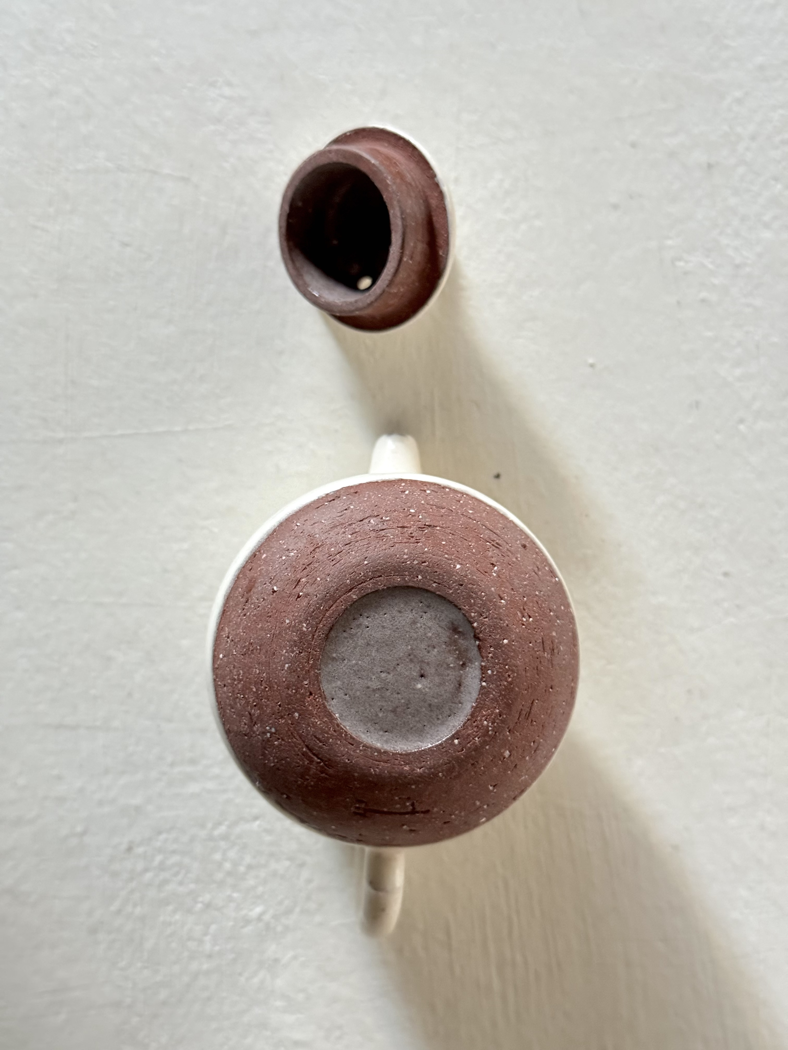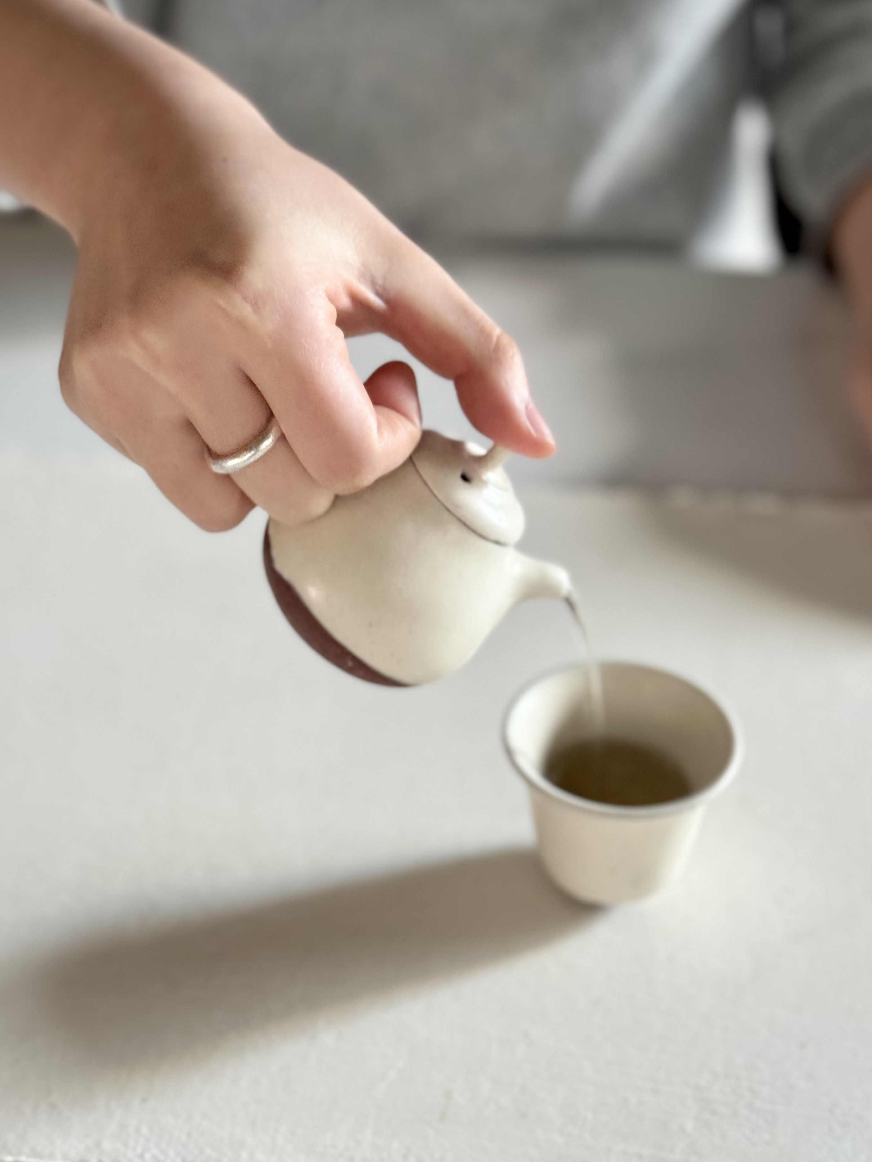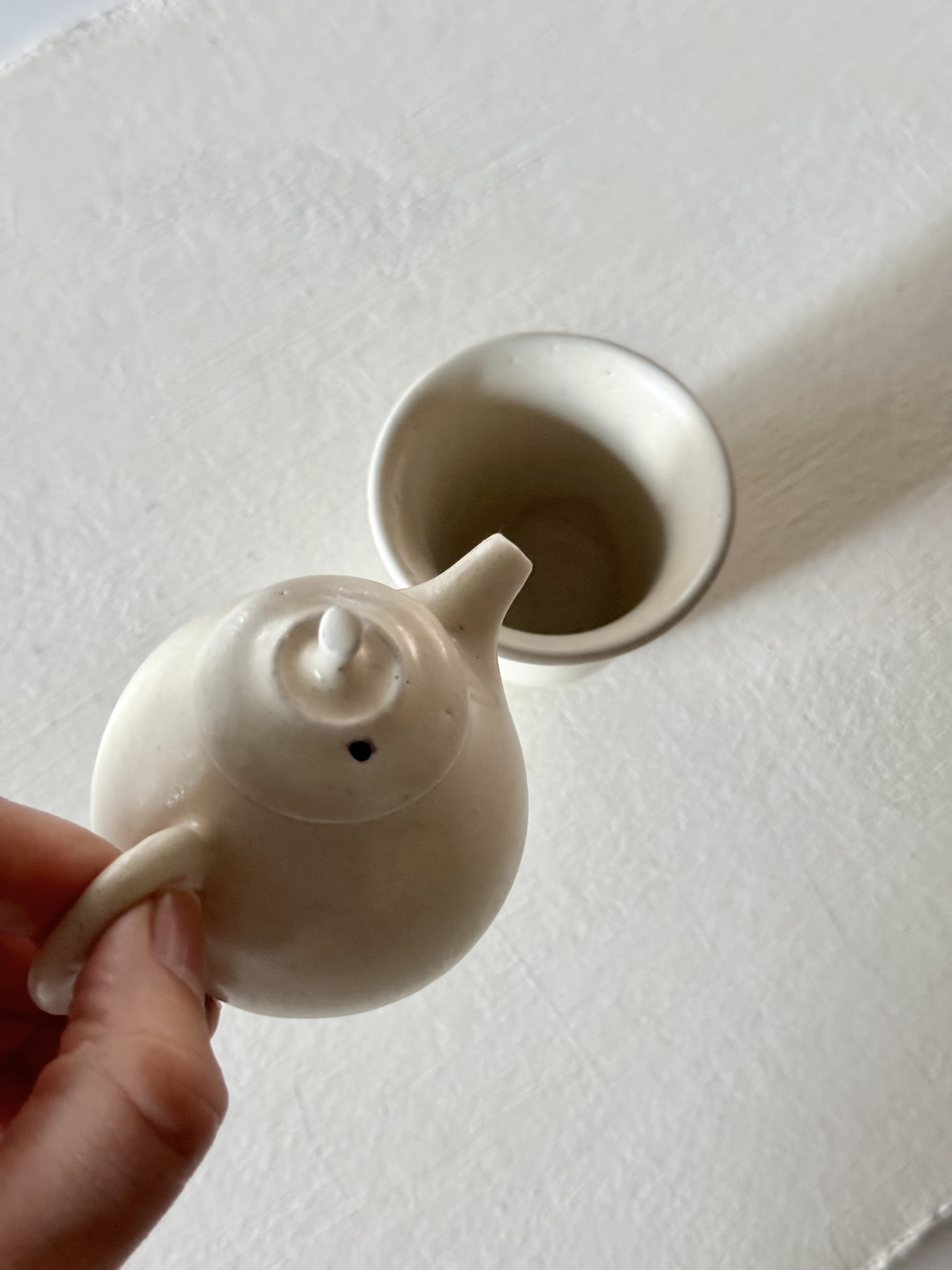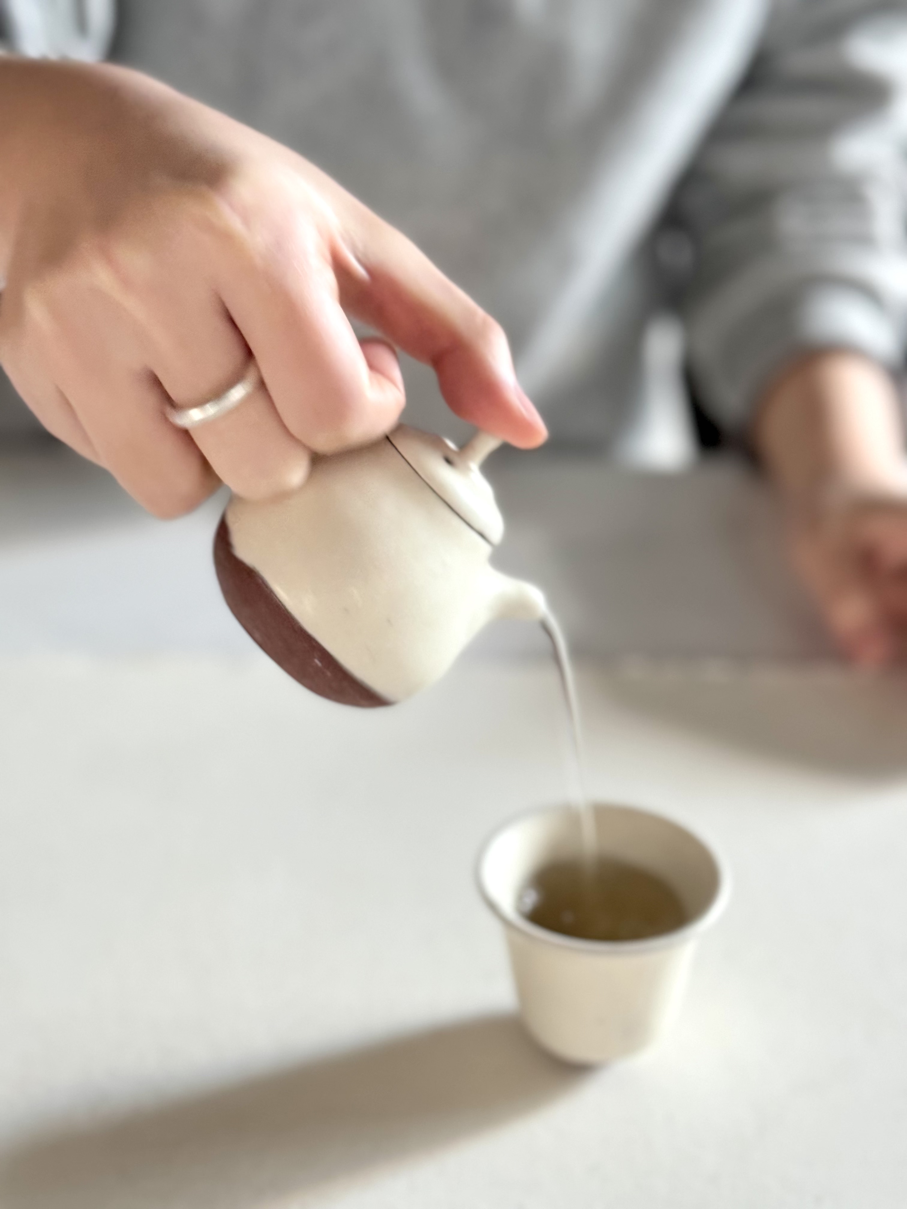 우윳빛색감의 차호는 1-2인 찻자리에서 사용하기 좋은 크기이며, 흘러내리는 유약과 표면의 질감이 매력적입니다.
