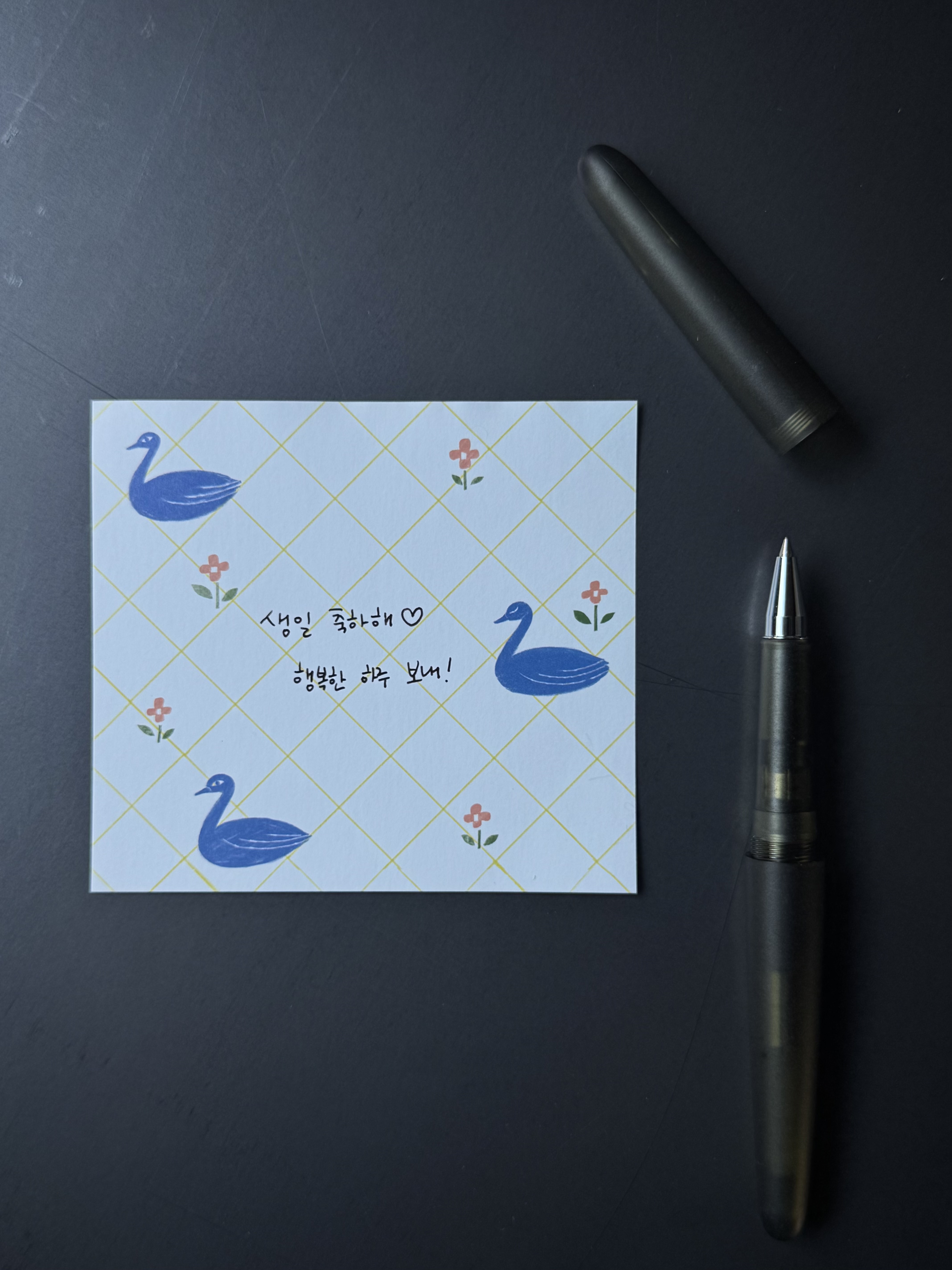종이는 두께감이 있어 뒷면에 비치지 않고 눈에 띄는 색감으로 짧은 내용의 편지나 메모를 하기에 좋습니다.