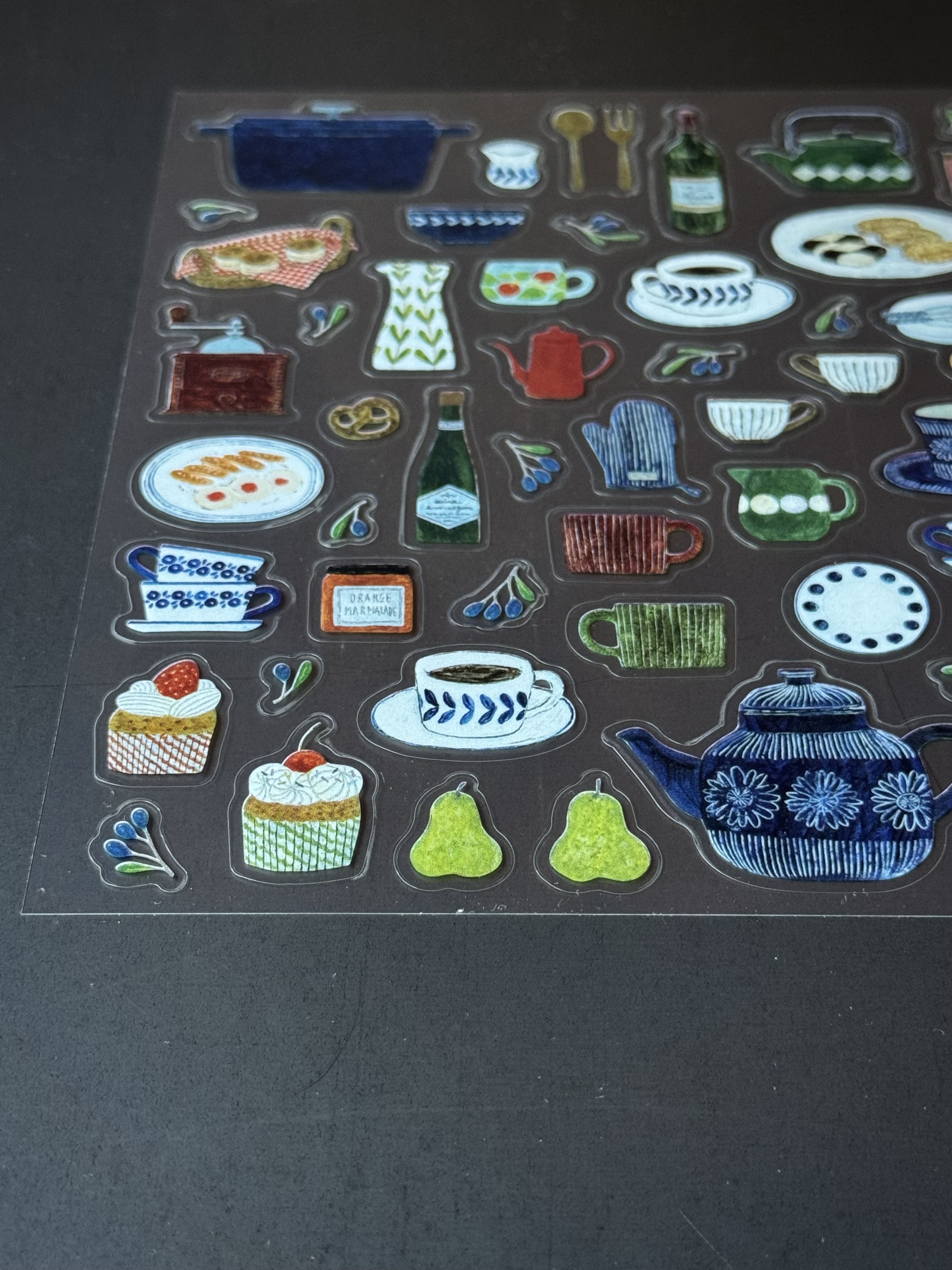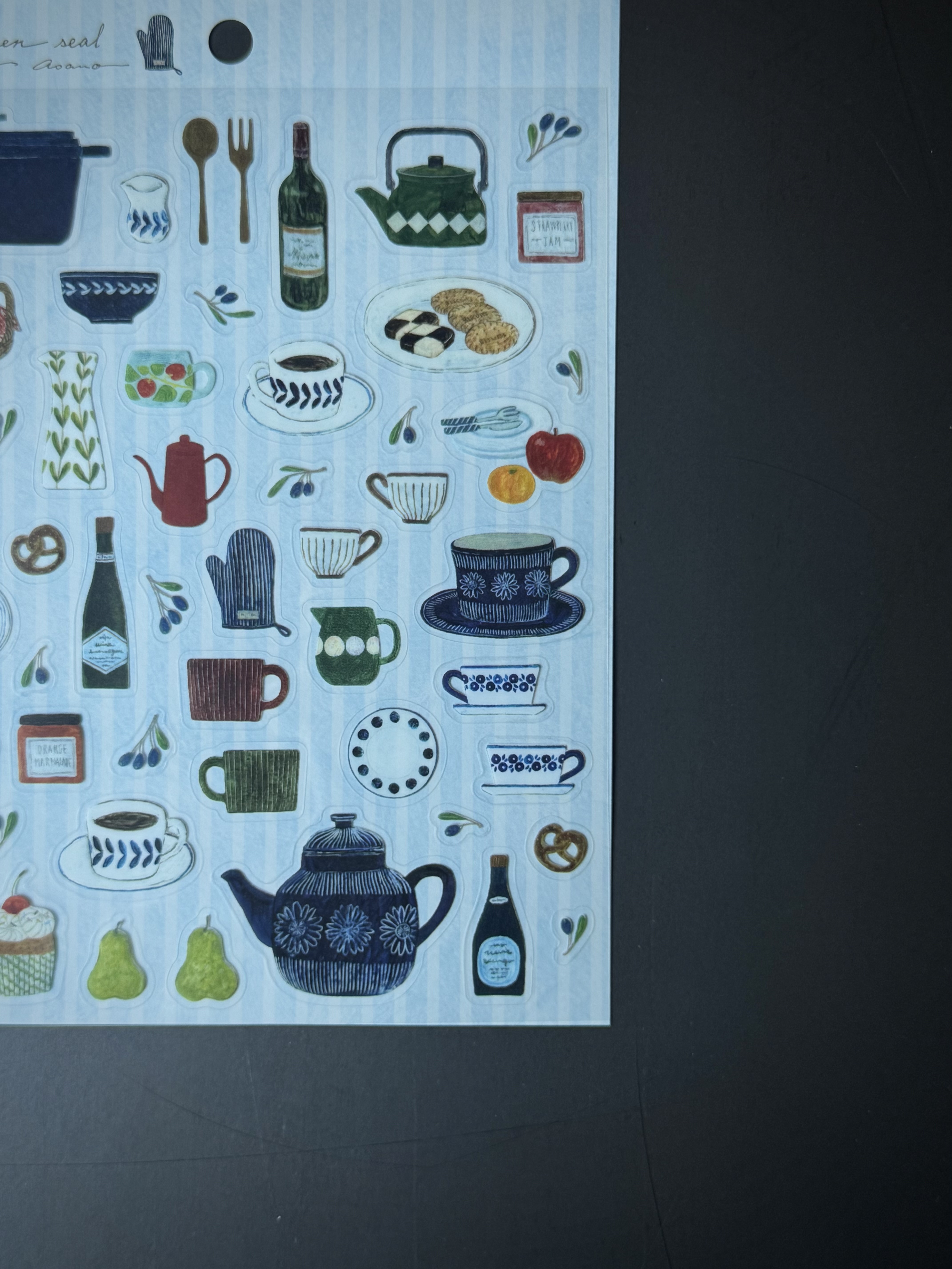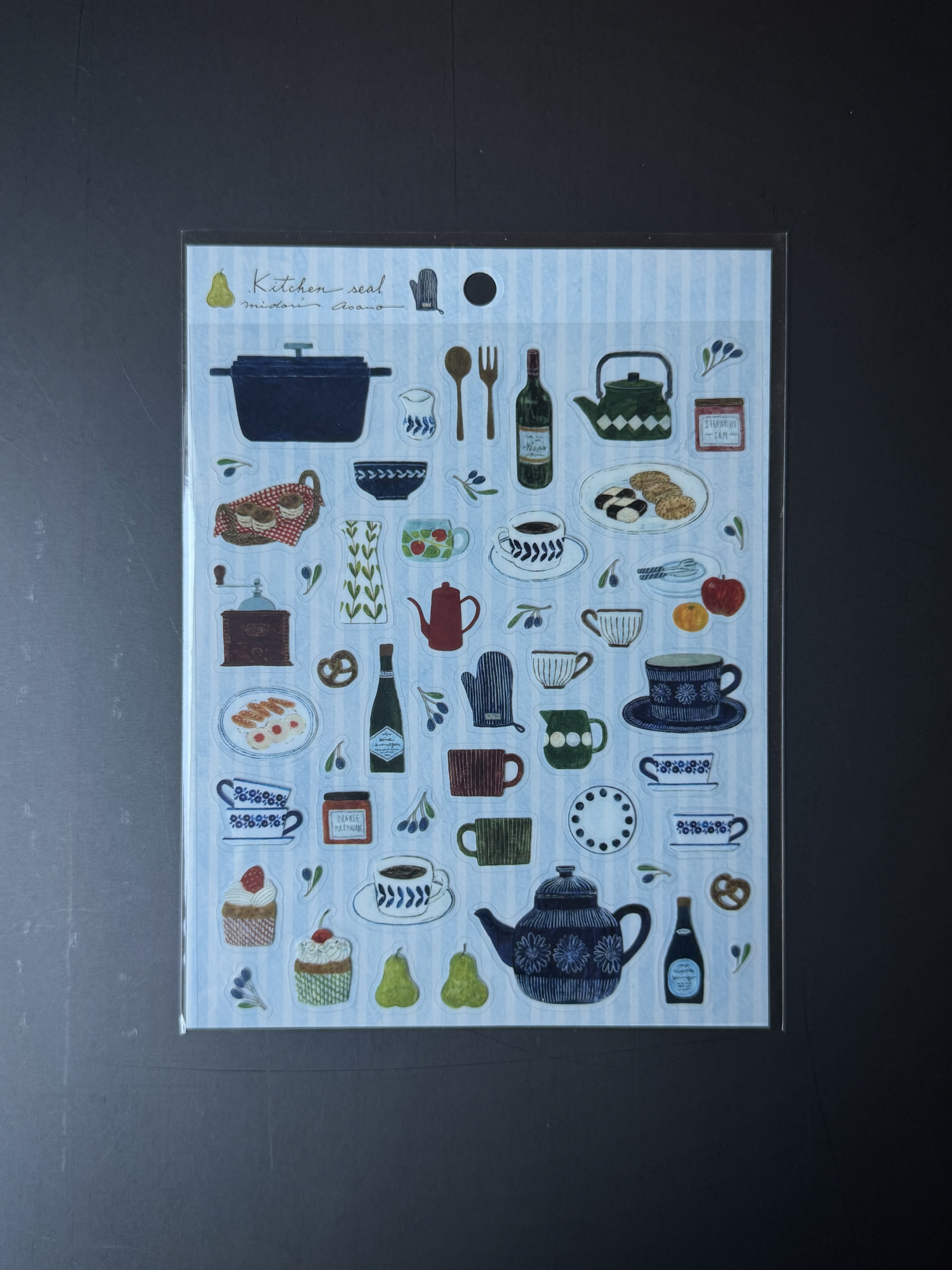 깨끗하게 늘어선 주방 도구와 맛있는 간식들이 가득한 아사노 미도리의 키친 씰스티커입니다. 반짝거리는 소재의 스티커는 크기 다양하게있어 다채로운 꾸미기가 될 것 같습니다. 빈티지한 그림체 또한 매력적입니다.