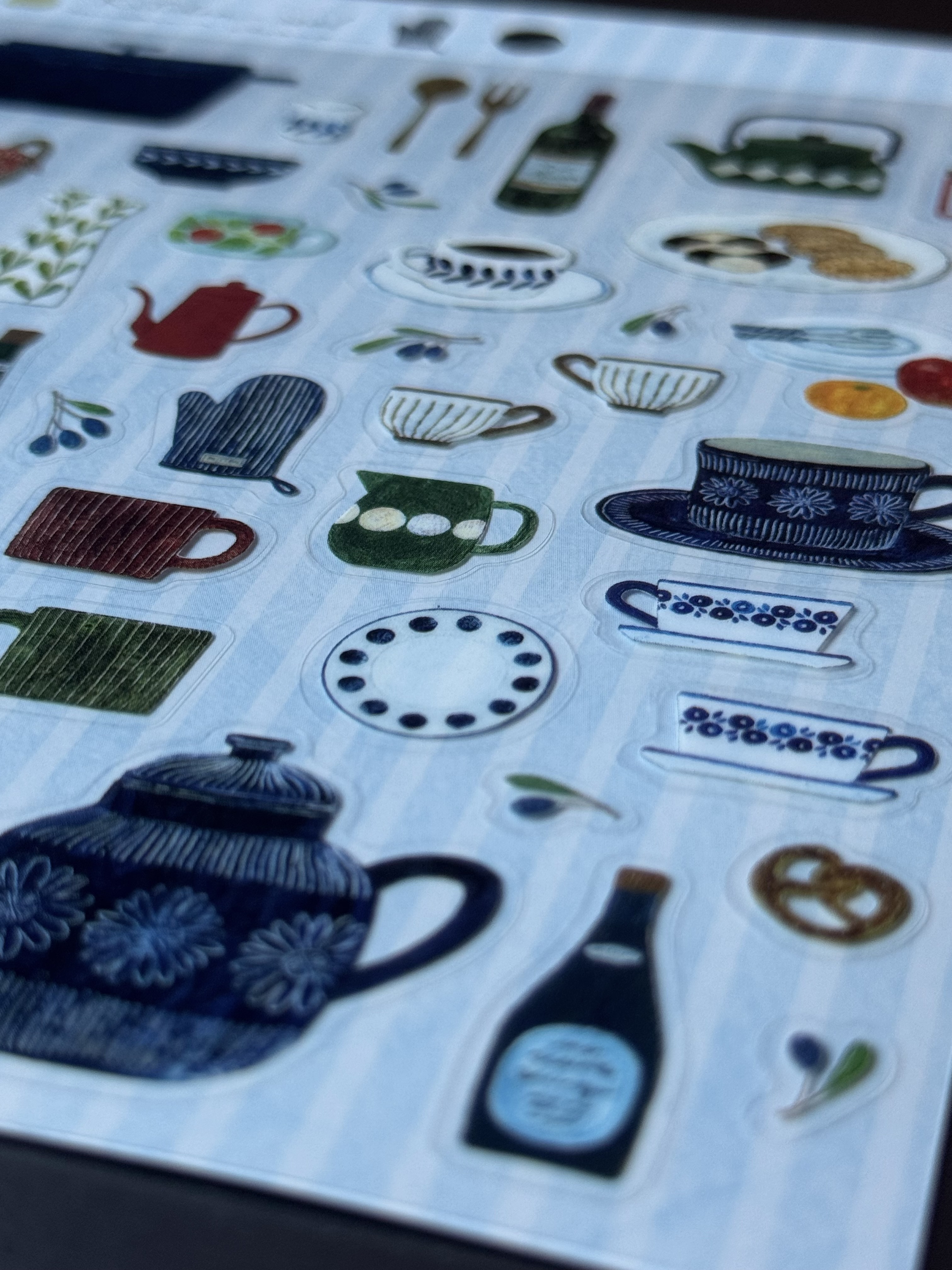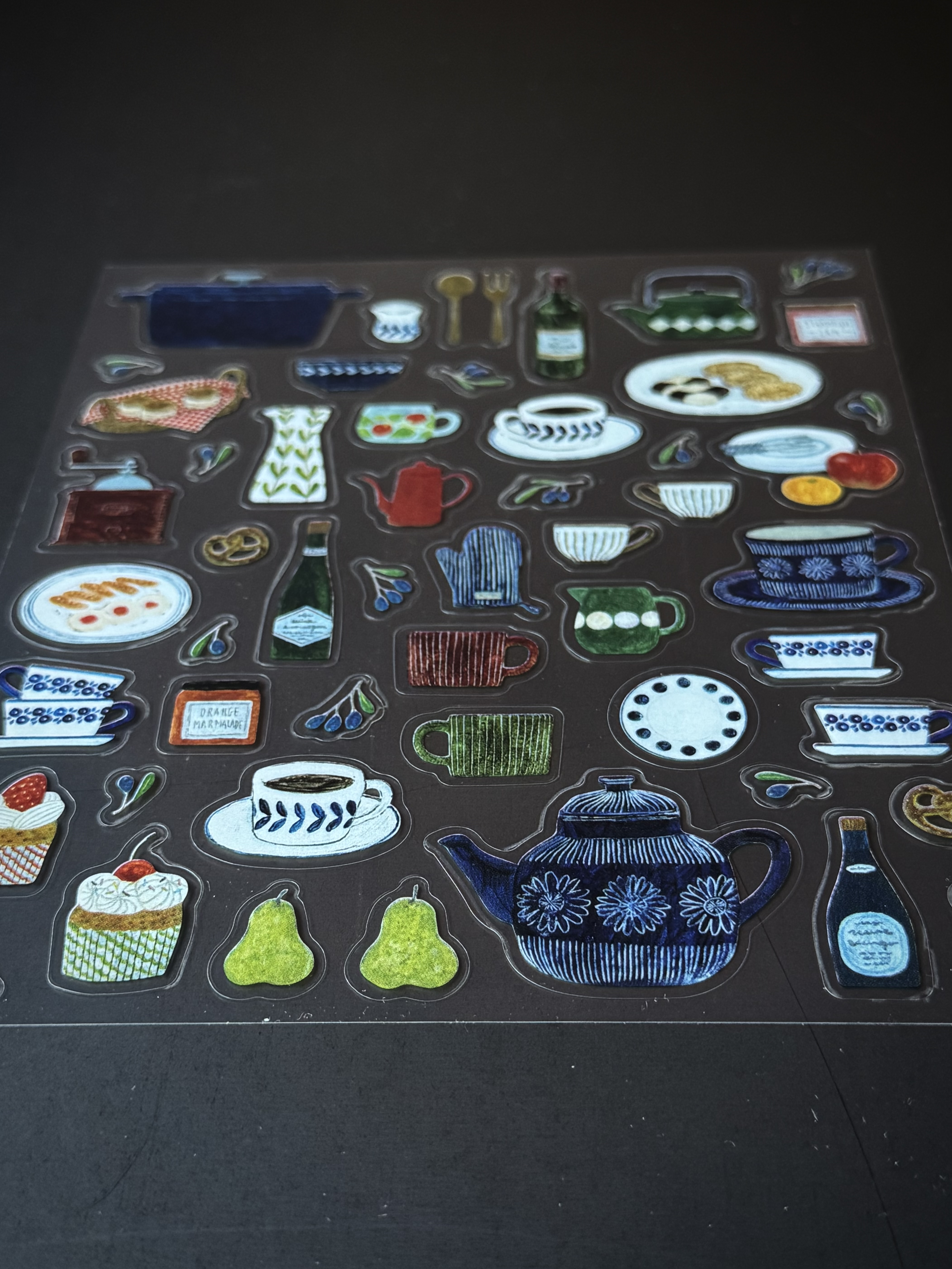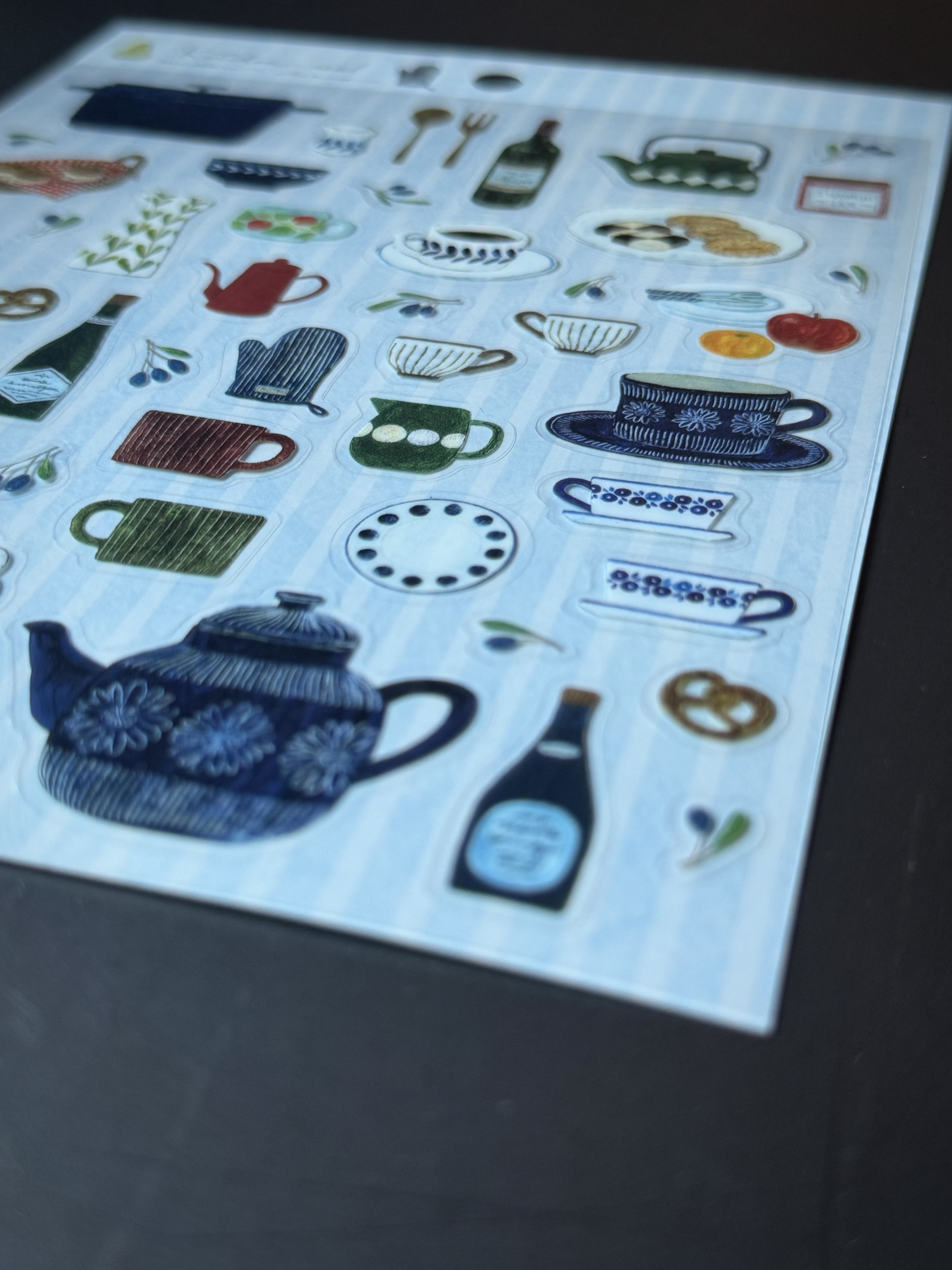 깨끗하게 늘어선 주방 도구와 맛있는 간식들이 가득한 아사노 미도리의 키친 씰스티커입니다. 반짝거리는 소재의 스티커는 크기 다양하게있어 다채로운 꾸미기가 될 것 같습니다. 빈티지한 그림체 또한 매력적입니다.