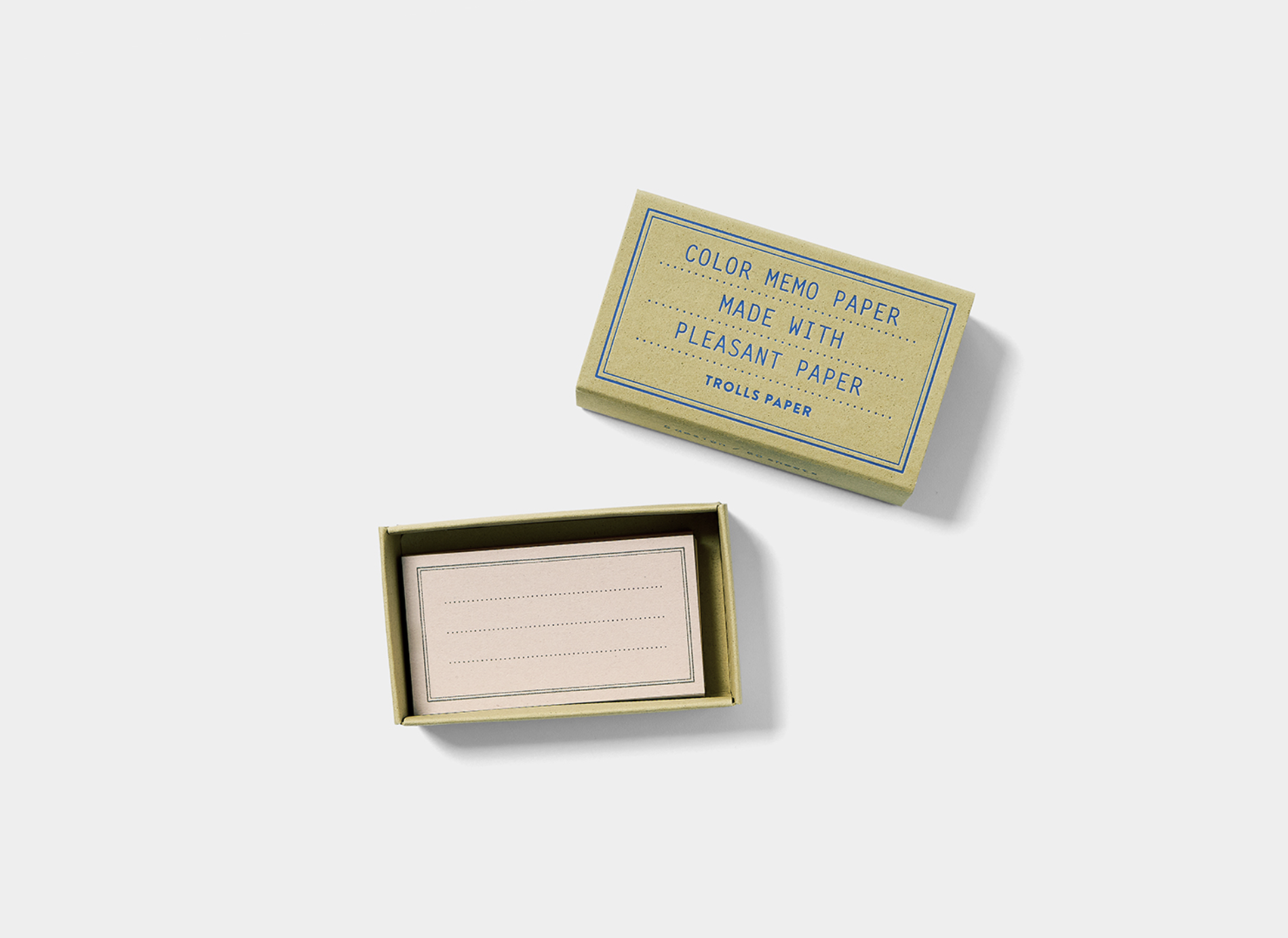 Memo Paper 상자는 다양한 식재료를 가공하는 과정에서 발생한 잔여물이 함유된 환경친화적인 종이 위 안료박으로 글씨가 새겨져