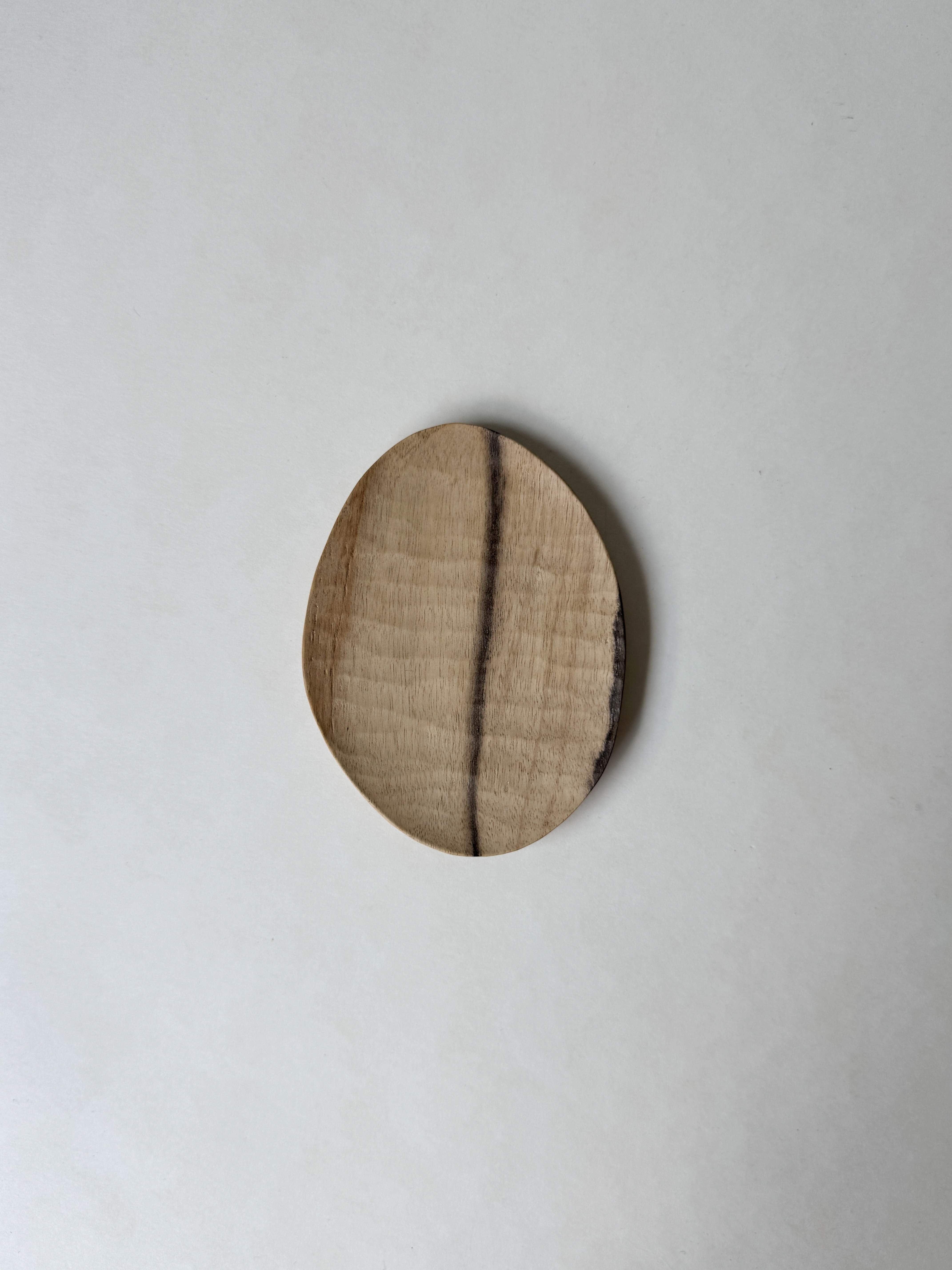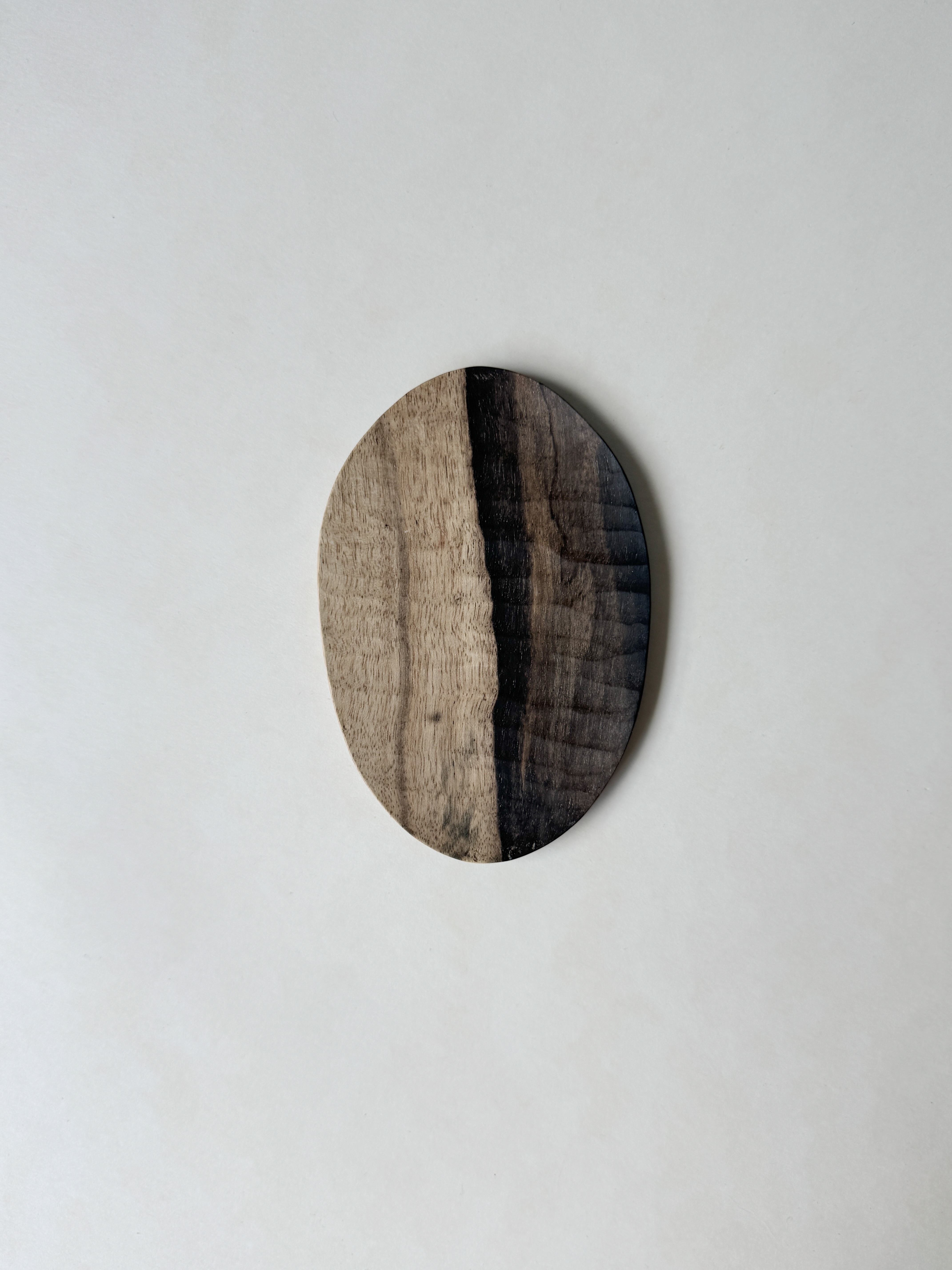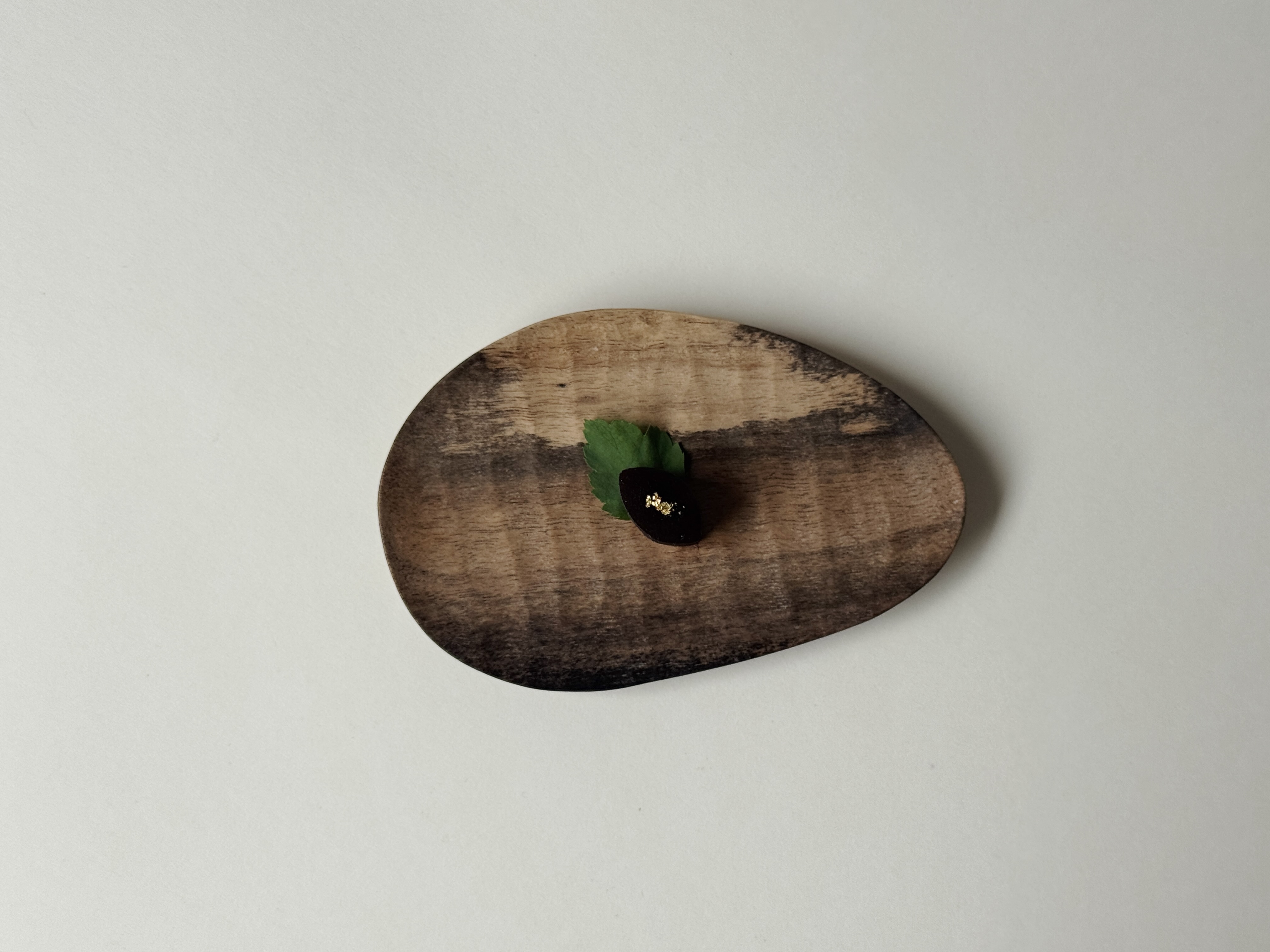 먹감나무는 목재의 불규칙성과 즉흥성을 가장 잘 보여주는 수종인 것 같아요. 깎다 보면 처음 예상했던 무늬가 완전히 다른 결과로 이어지는 경우가 많은데, 그런 예측 불가능함이 매력적으로 느껴져요. 또 먹이 스며든 모습에서 동양적인 정서가 묻어나서인지 외국인 분들도 좋아해 주세요. 이 접시의 결도 안개 낀 새벽하늘 아래 나무가 서 있는 풍경을 닮았죠? 늬은을 위해 준비 중인 작업도 먹감나무를 사용했어요. 조약돌을 닮은 작은 다식 접시를 만들고 있어요. 함께 쓸 다식 꽂이는 내구성이 좋은 흑단을 사용하고요. -作業記術誌 Vol. 5 단소아 中