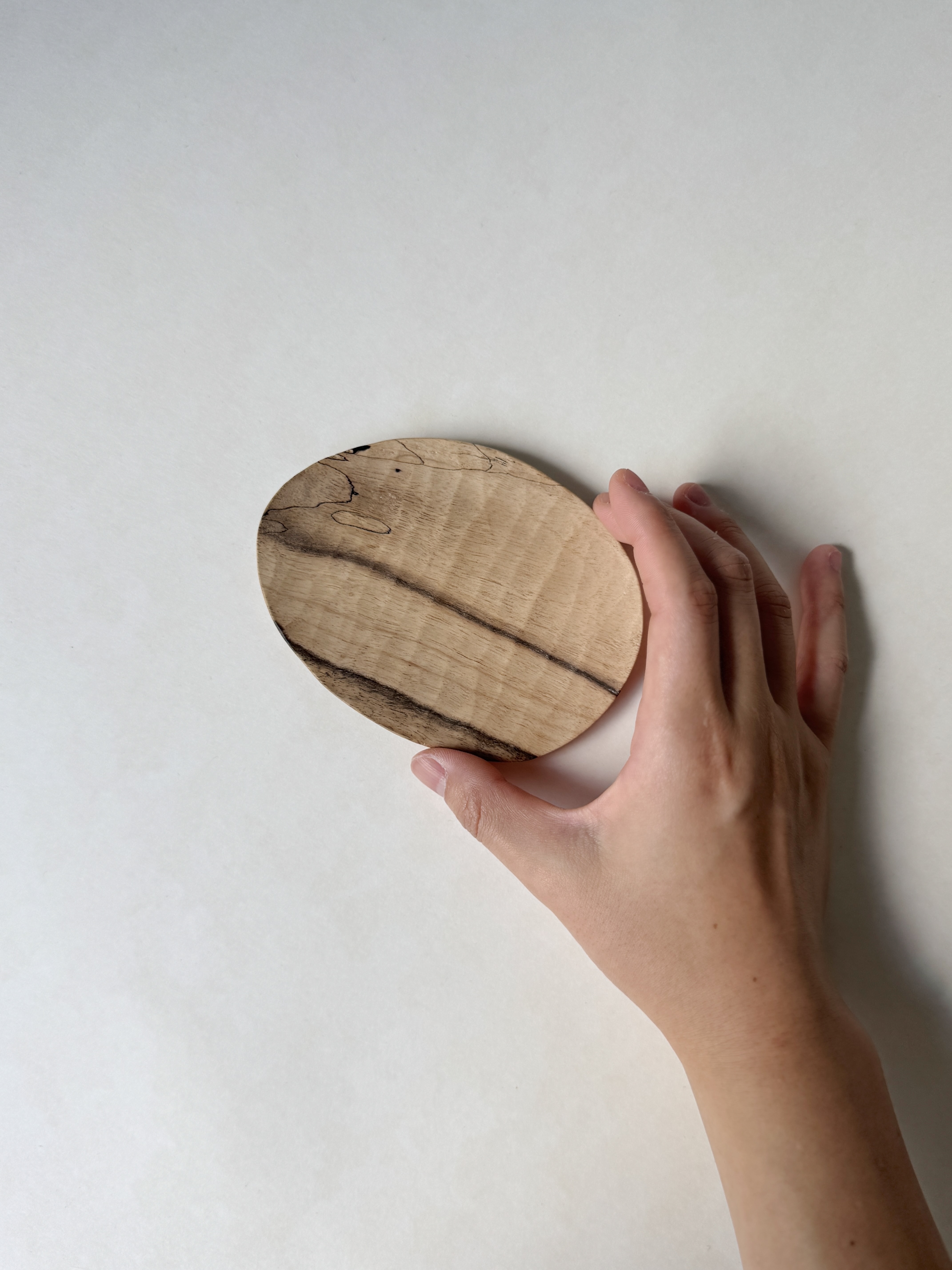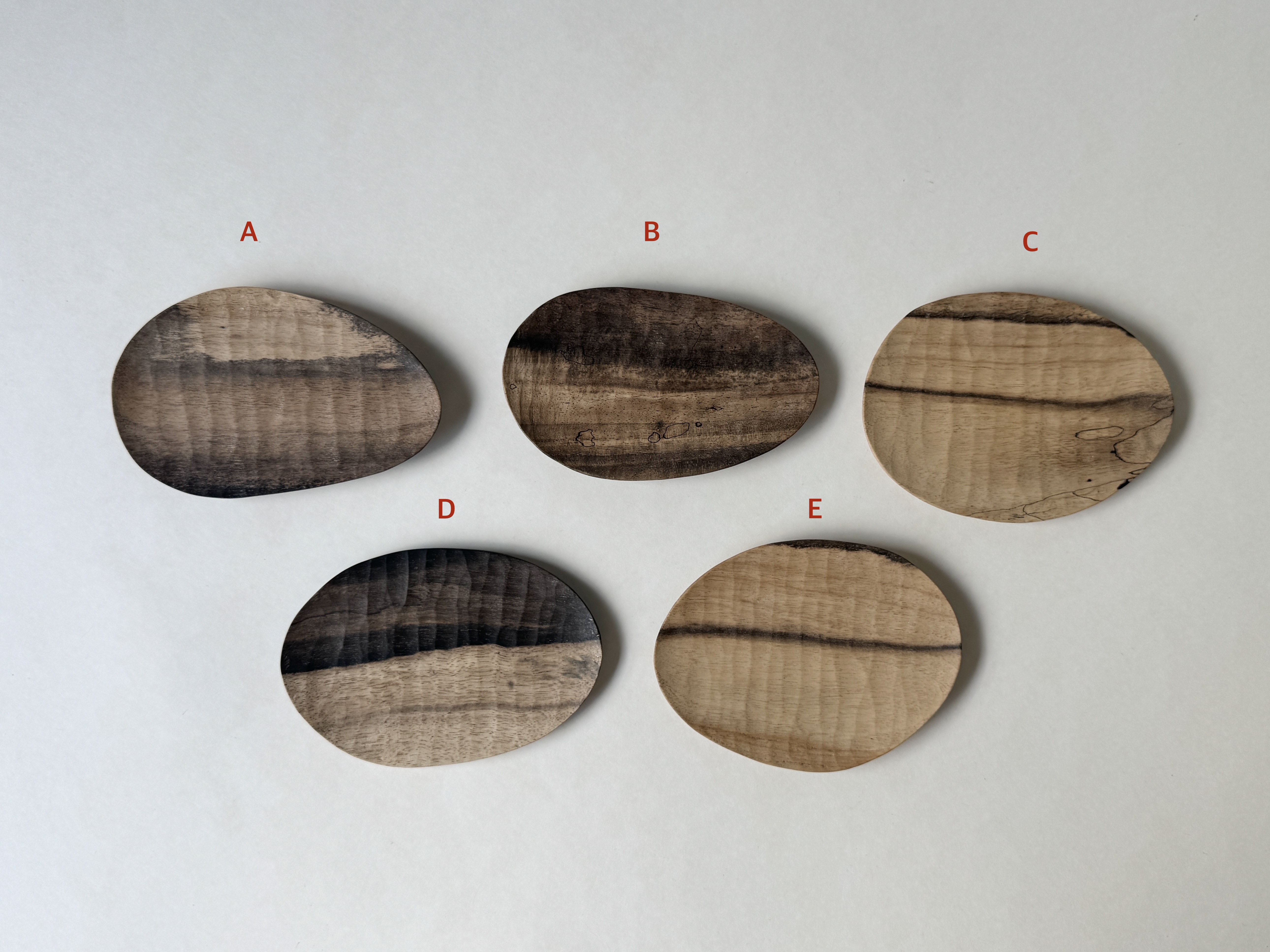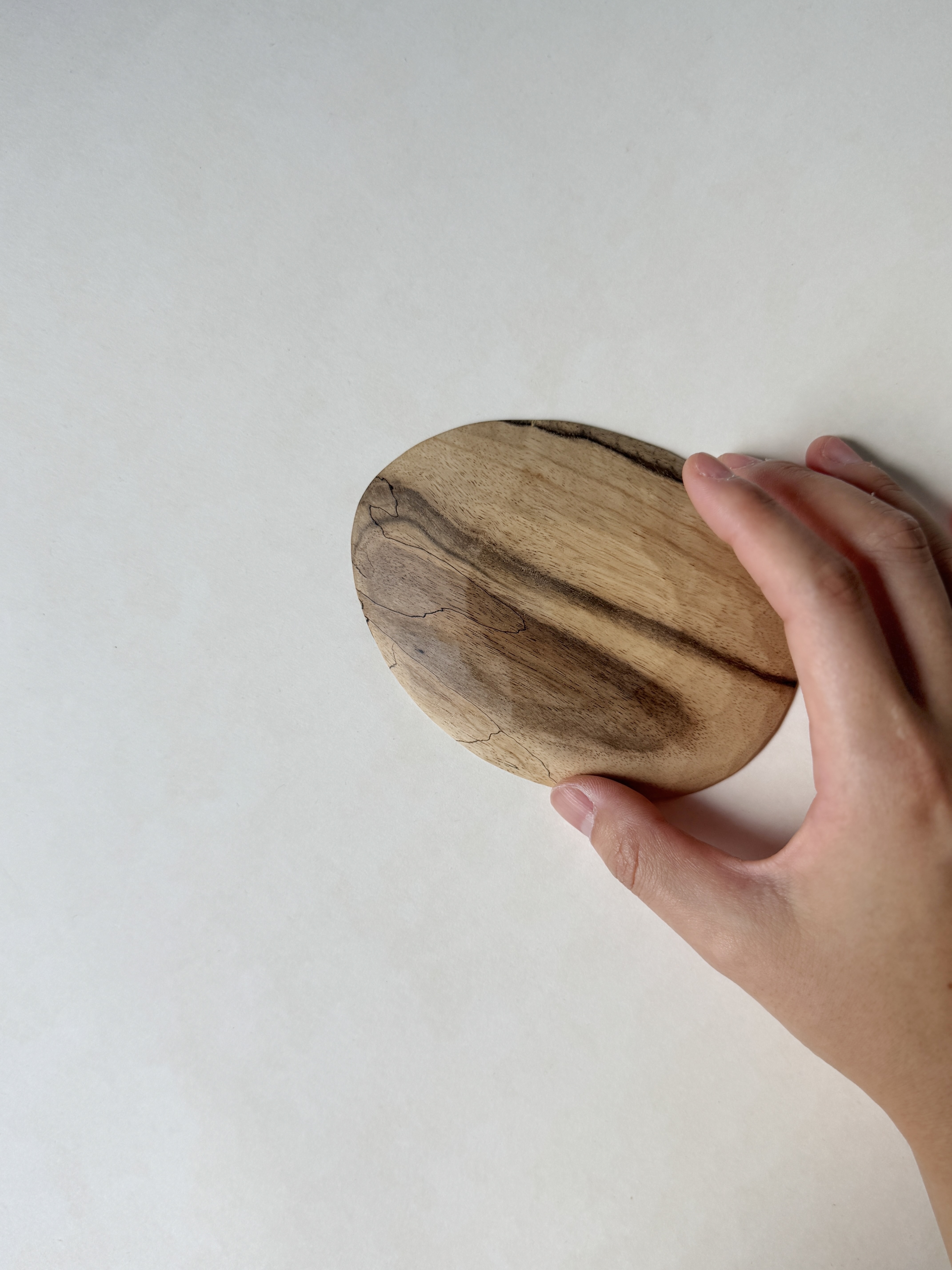 먹감나무는 목재의 불규칙성과 즉흥성을 가장 잘 보여주는 수종인 것 같아요. 깎다 보면 처음 예상했던 무늬가 완전히 다른 결과로 이어지는 경우가 많은데, 그런 예측 불가능함이 매력적으로 느껴져요. 또 먹이 스며든 모습에서 동양적인 정서가 묻어나서인지 외국인 분들도 좋아해 주세요. 이 접시의 결도 안개 낀 새벽하늘 아래 나무가 서 있는 풍경을 닮았죠? 늬은을 위해 준비 중인 작업도 먹감나무를 사용했어요. 조약돌을 닮은 작은 다식 접시를 만들고 있어요. 함께 쓸 다식 꽂이는 내구성이 좋은 흑단을 사용하고요. -作業記術誌 Vol. 5 단소아 中