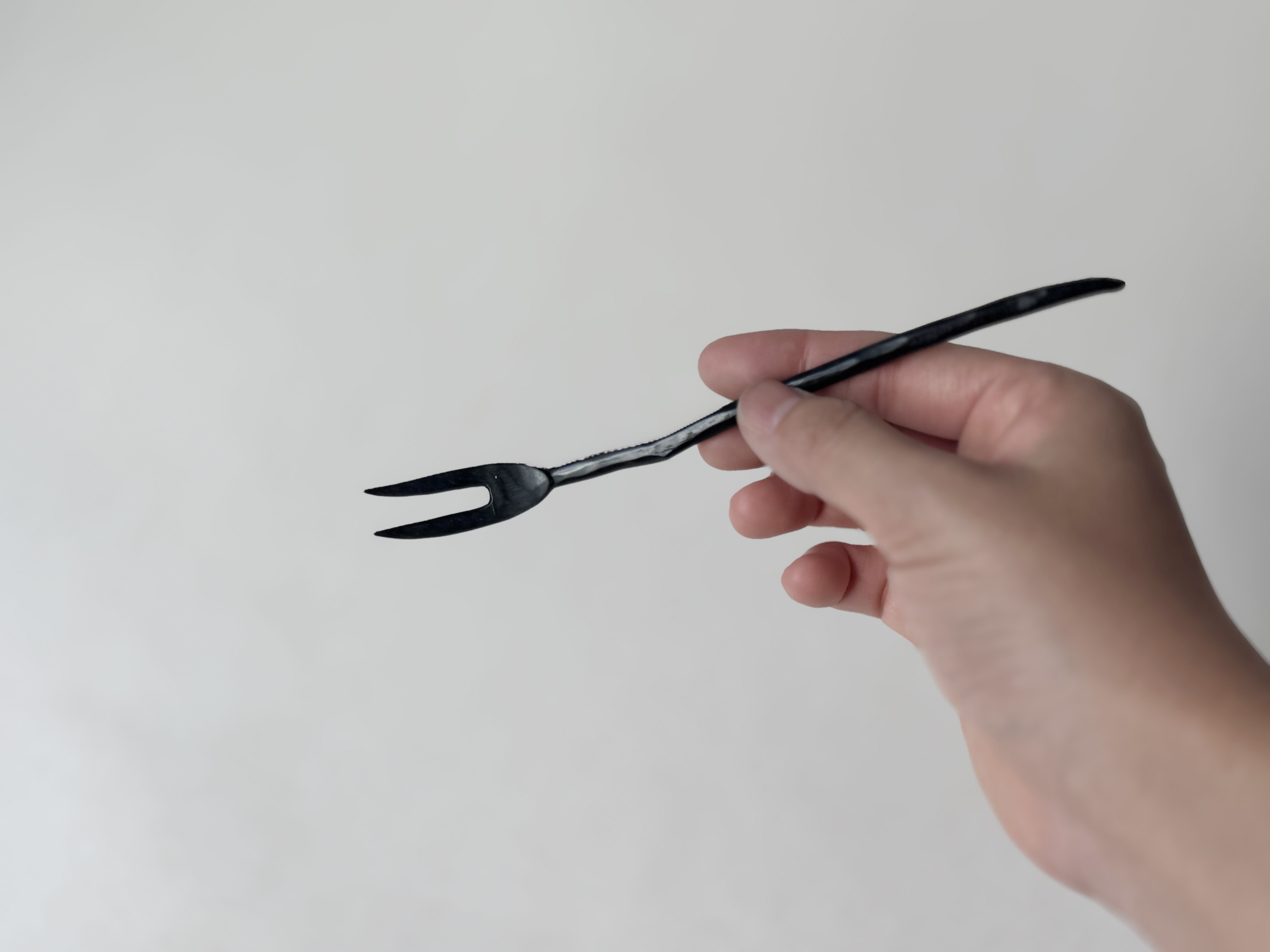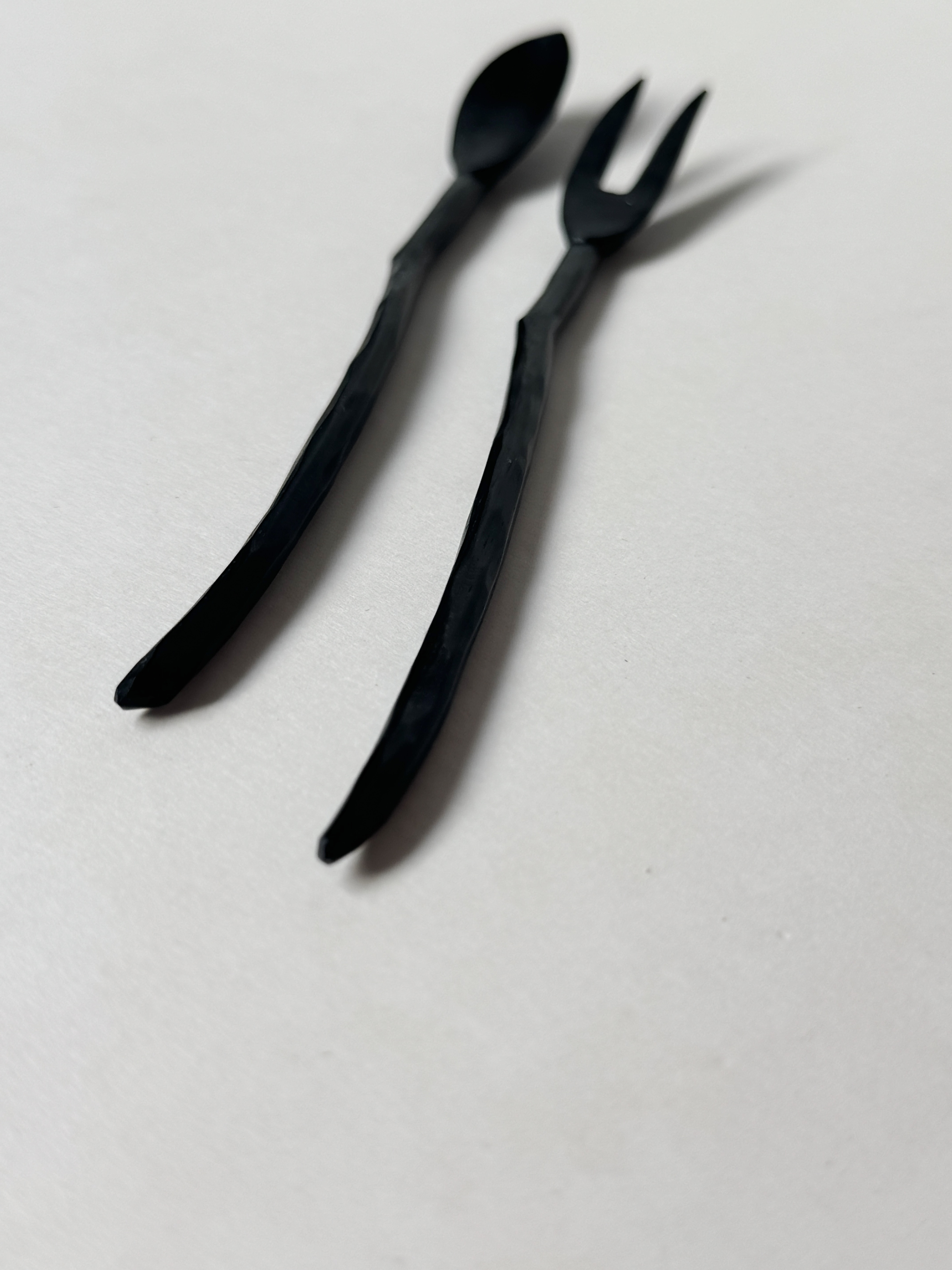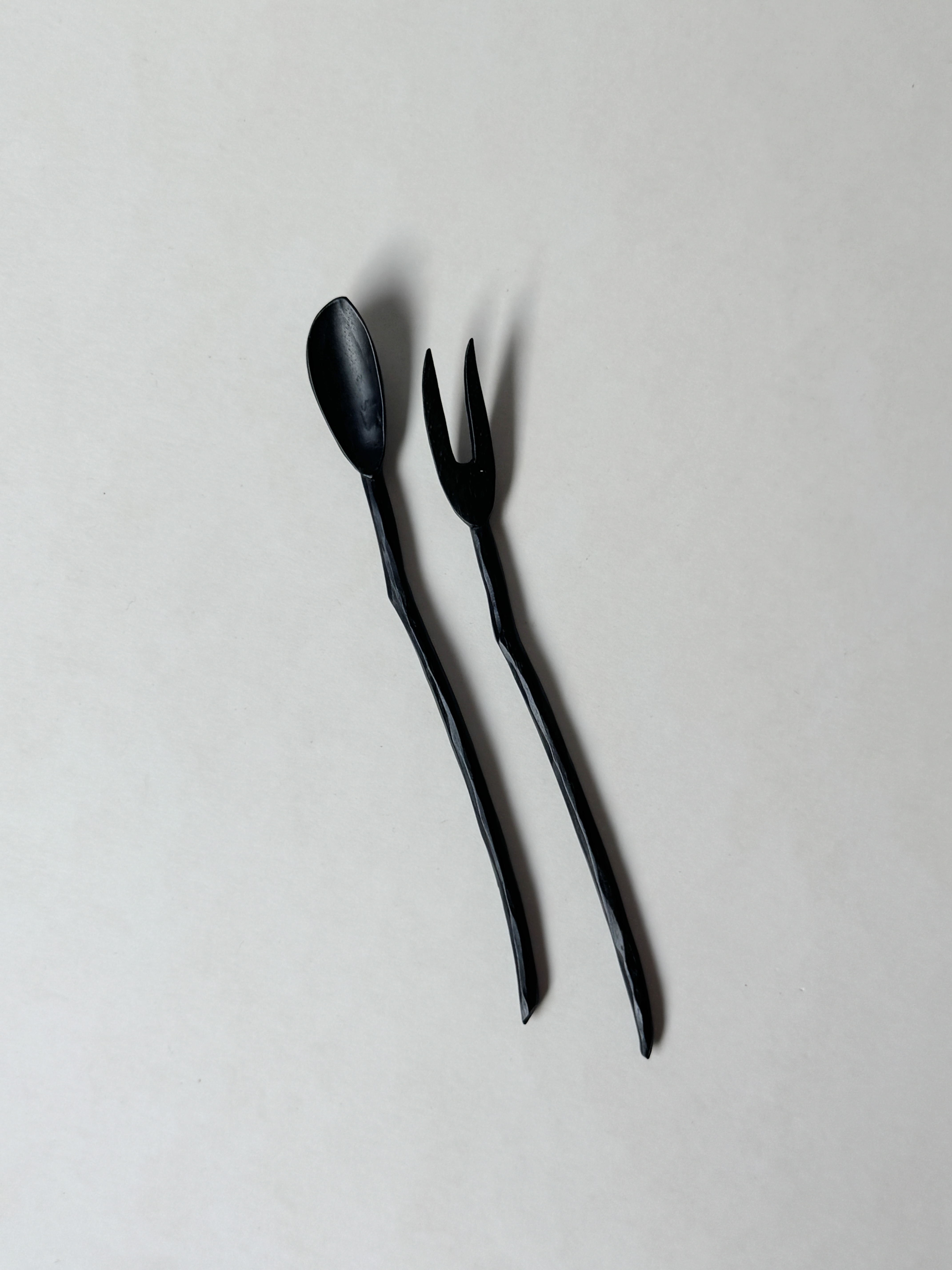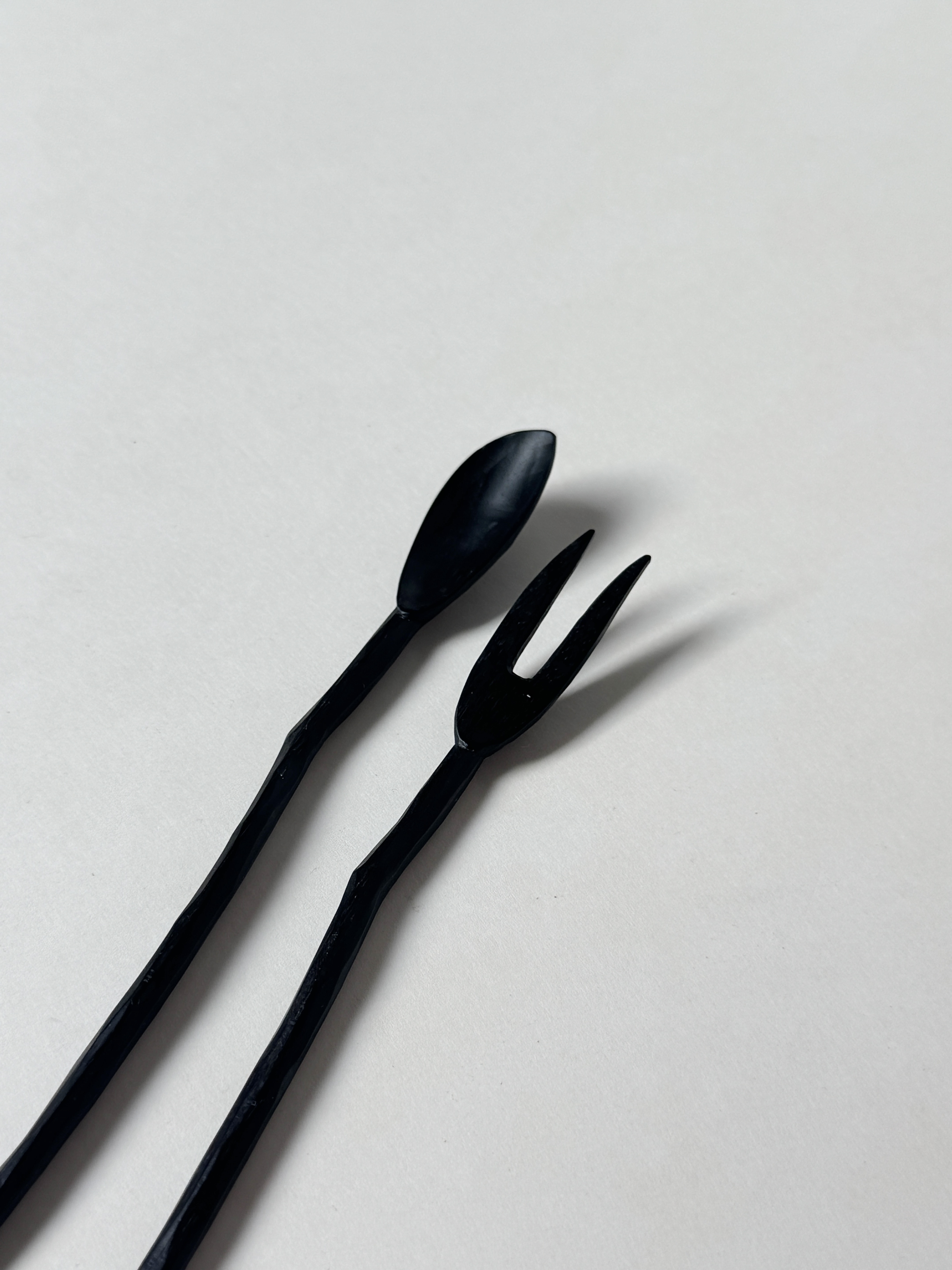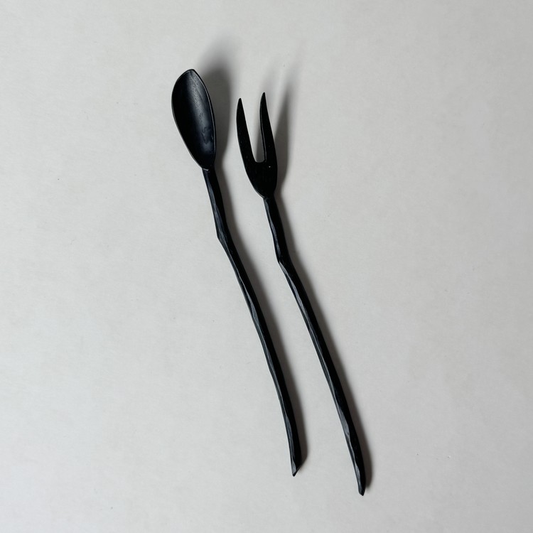 내구성이 좋은 흑단으로 제작된 나뭇가지 형태의 스푼과 포크입니다.