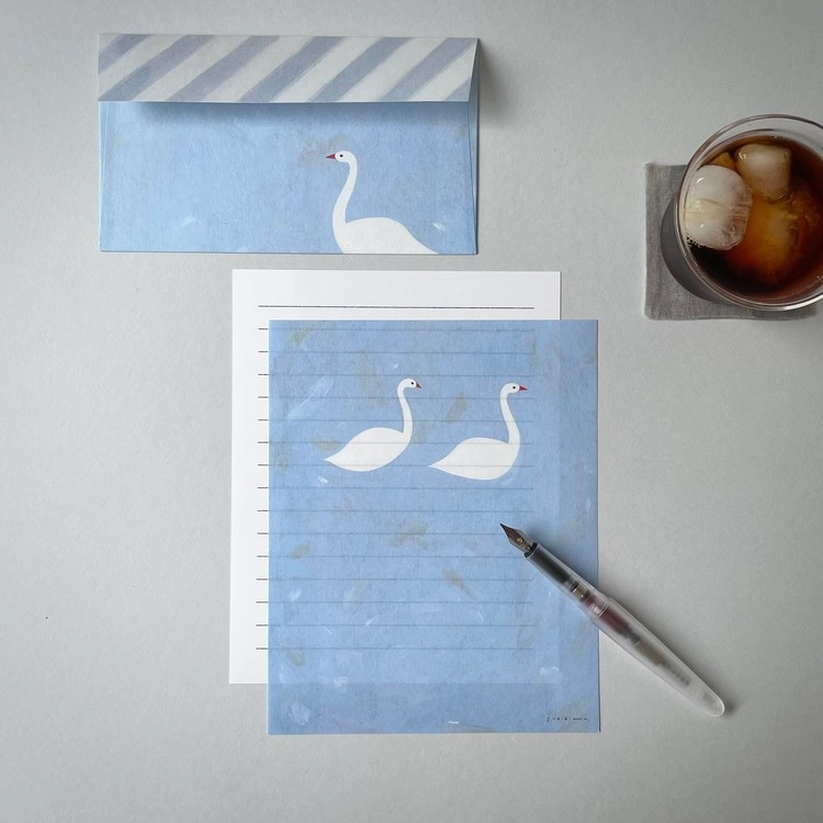 호수에 유유히 떠다니는 2마리의 백조가 그려진 편지지입니다.